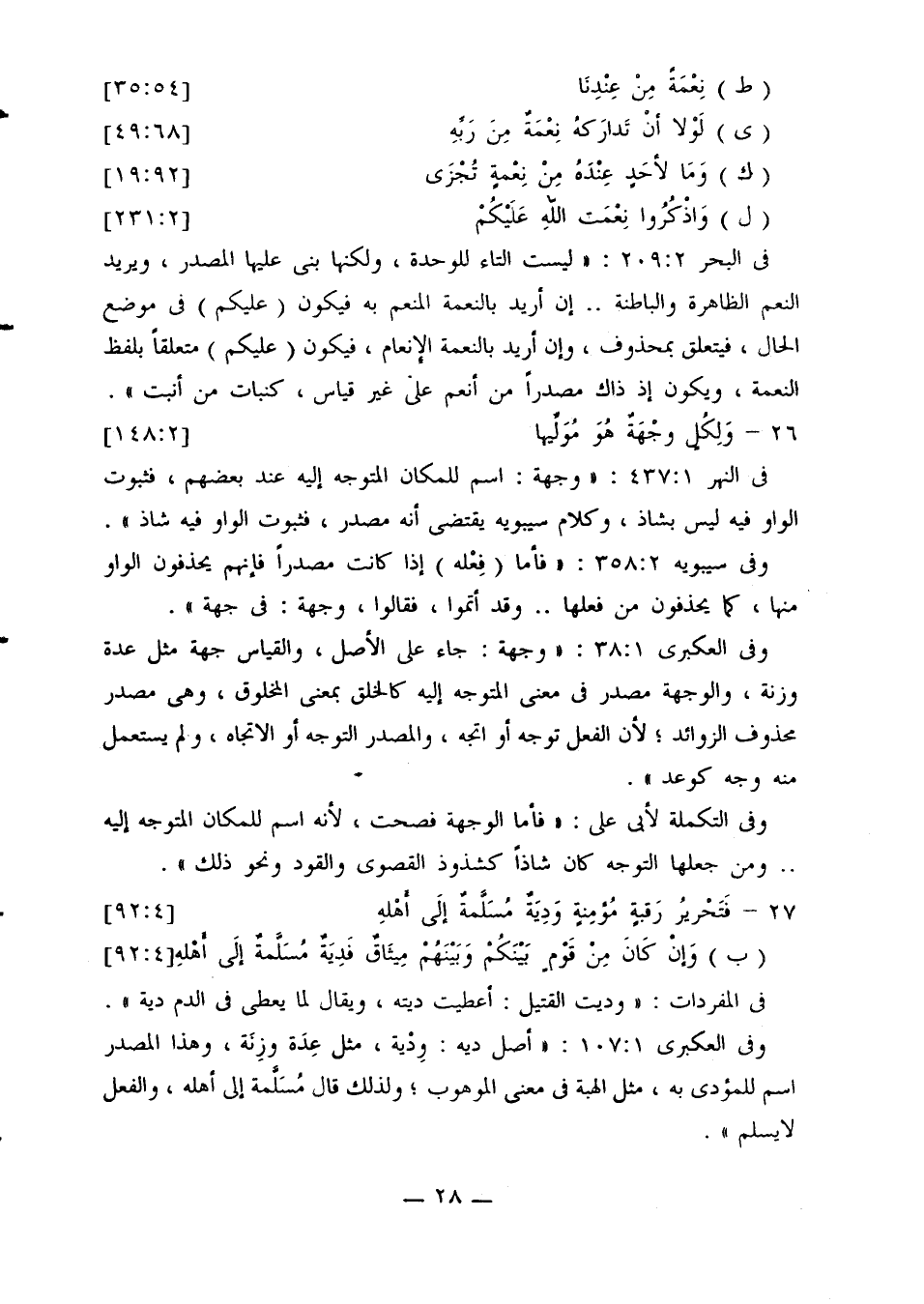 وفي العكبري 1: 24: " الأصل في شية وشية، لأنه من وشي يشي، فلما حذفت الواو في الفعل حذفت في المصدر، وعوضت التاء من المحذوف ".