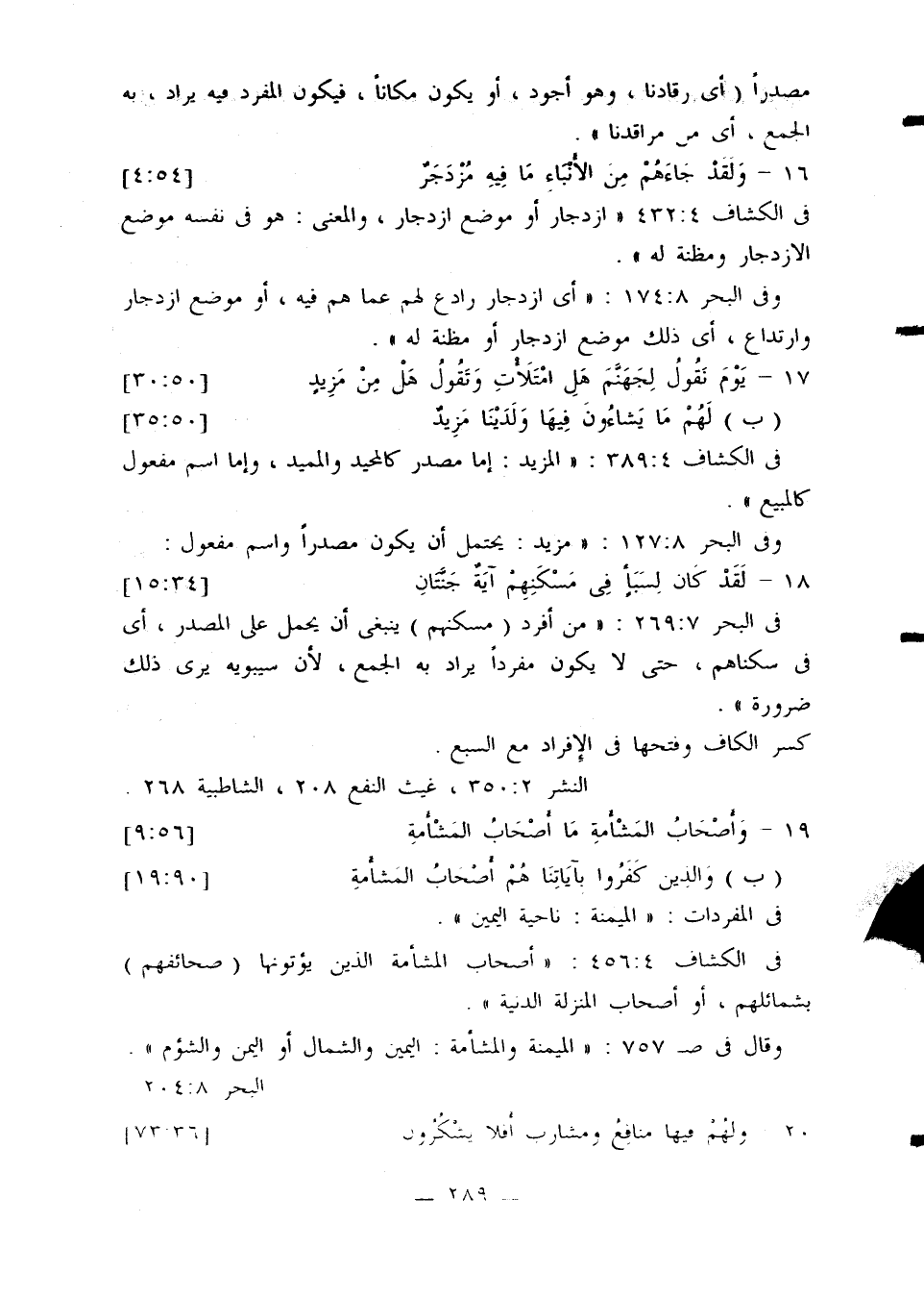 وفي البحر 6: 190: «مشهد: مفعل من الشهود، وهو الحضور، أو من الشهادة، ويكون مصدرًا وزمانًا ومكانًا، فمن الشهود يجوز أن يكون المعنى: من شهود هول الحساب والجزاء في يوم القيامة، وأن يكون من مكان الشهود فيه، وهو الموقف، وأن يكون من وقت الشهود.