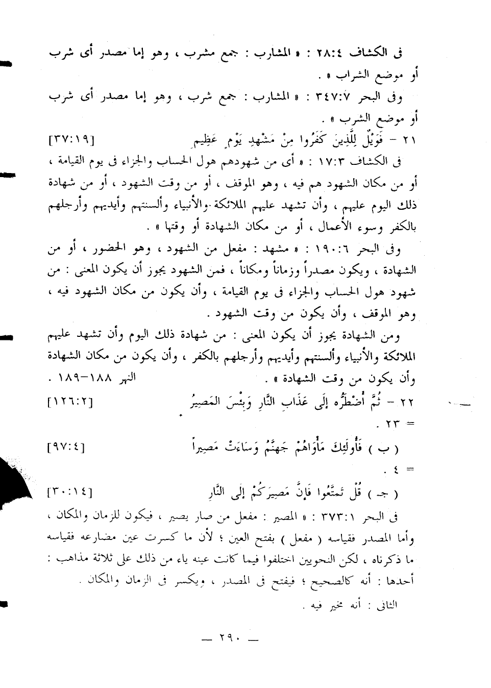 في البحر 2: 366: «المصير: اسم مصدر من صار يصير، وهو مبني على (مفعل) بكسر العين، وقد اختلف النحويون في بناء (المفعل) مما عينه ياء، نحو: يبيت ويعيش ويحيض ويقيل ويصير. فذهب بعضهم إلى أنه كالصحيح، نحو: (يضرب)، يكون للمصدر بالفتح، نحو: {وجعلنا النهار معاشا} أي عيشًا؛ فيكون (المحيض) بمعنى المحيض، والمصير بمعنى الصيرورة على هذا شاذًا. وذهب بعضهم إلى التخيير في المصدر بين أن تبنيه على (مفعل) بكسر العين أو (مفعل) بفتحها، وأما الزمان والمكان فبالكسر، ذهب إلى ذلك الزجاج، ورد عليه أبو علي. وذهب بعضهم إلى الاقتصار على السماع. . . وهذا المذهب أحوط».