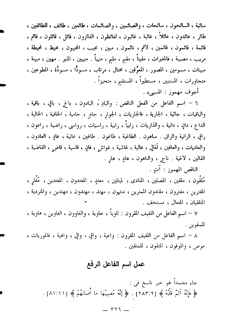 1 - لا بد له من الاعتماد وأن يكون بمعنى الحال أو الاستقبال فلا يعمل النصب، وهو بمعنى الماضي، وقوله تعالى {وكلبهم باسط ذراعيه بالوصيد} [18: 18]. حكاية الحال الماضية وأجاز الكسائي وهشام عمله، وهو بمعنى الماضي. البحر 6: 109، الكشاف 2: 709.