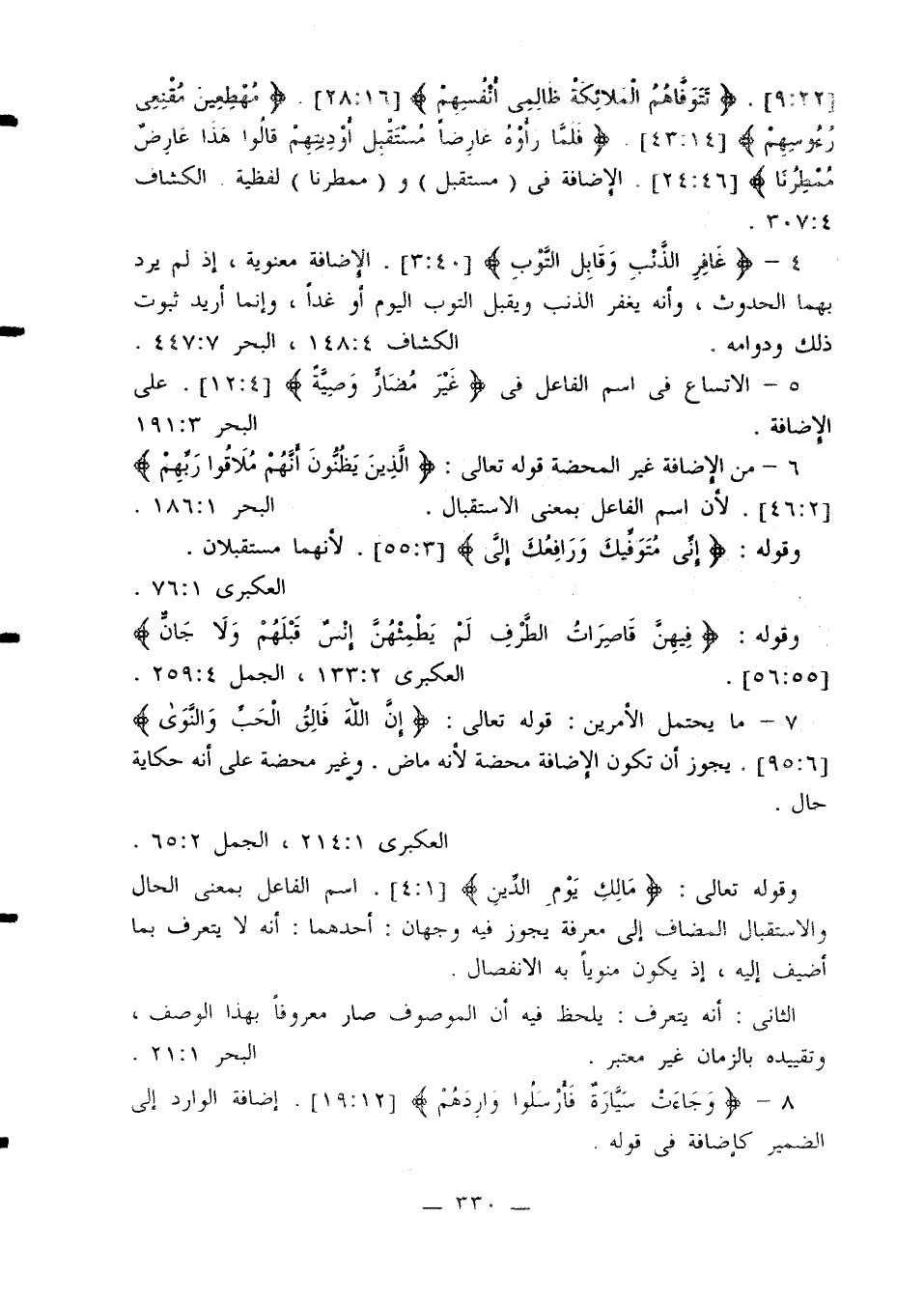 10 - إضافة اسم الفاعل إنما كانت إضافة إلى المفعول في غير هذه المواضع: {أجيبوا داعي الله} [46: 31]. {ومن لا يجب داعي الله فليس بمعجز} [46: 32]. {وآخر دعواهم أن الحمد لله} [10: 10]. {إنه كان صادق الوعد} [19: 54]. {وجبريل وصالح المؤمنين} [66: 4]. {إن ربك واسع المغفرة} [53: 32]. {فليأت مستمعهم بسلطان} [52: 38]. {فأصابتكم مصيبة الموت} [5: 106]. {أكابر مجرميها} [6: 123].