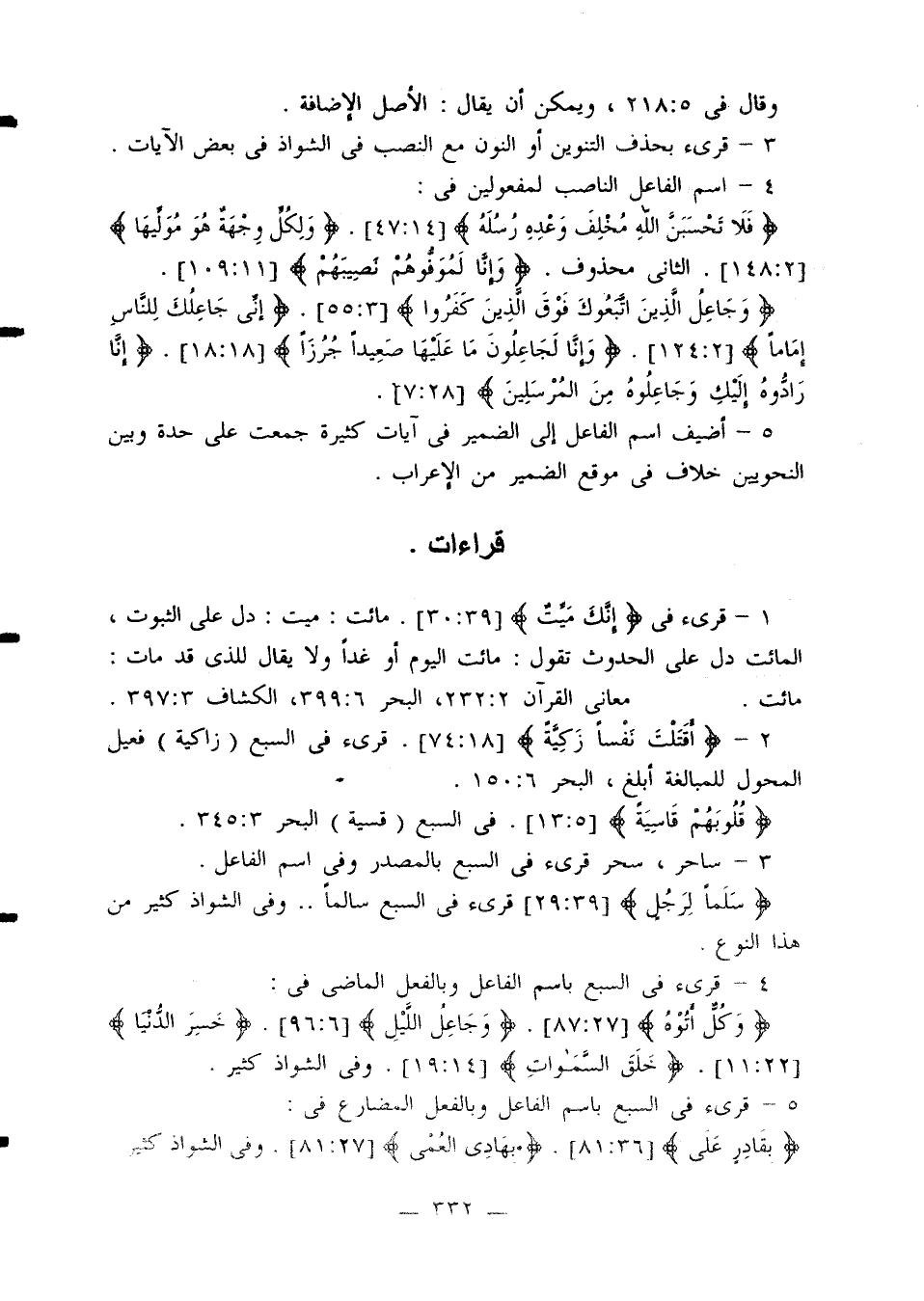 6 - قرئ في السبع باسم الفاعل من (أفعل) ومن (فعل) في: {من موص} [2: 182]. {المعذرون} [9: 90]. وفي الشواذ كثير.