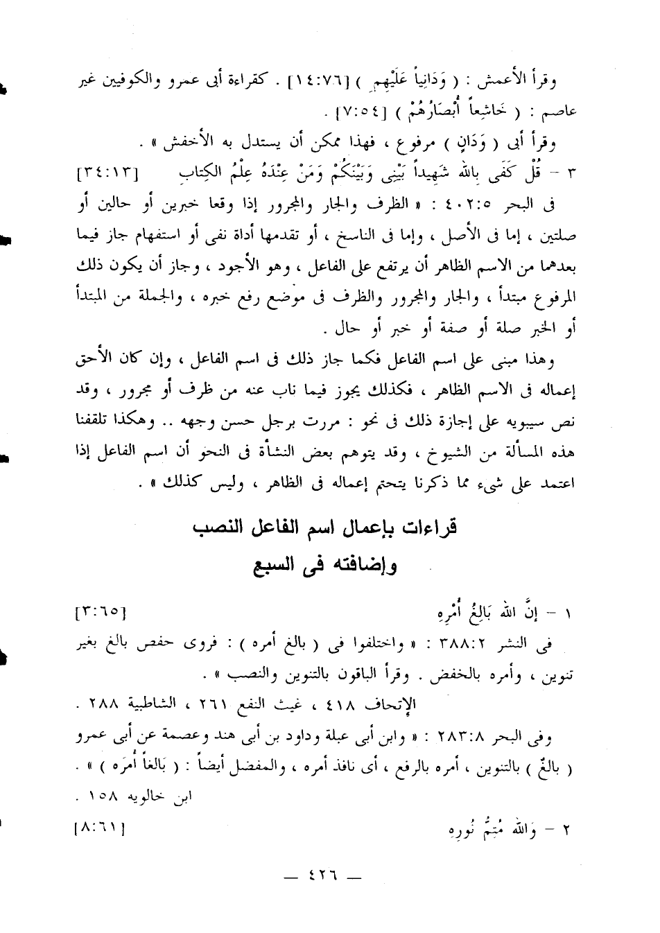 في النشر 2: 387: «واختلفوا من (متم نوره) فقرأ ابن كثير وحمزة والكسائي وخلف وحفص (متم) بغير تنوين، و (نوره) بالخفض. وقرأ الباقون بالتنوين والنصب». الإتحاف 415، غيث النفع 259، الشاطبية 288، البحر 8: 263.