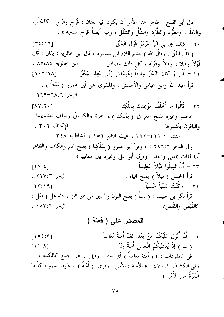 وفي البحر 2: 85: «الأمنة: الأمن، قاله ابن قتيبة وغيره: وفرق آخرون فقالوا: الأمنة: مع بقاء أسباب الخوف، والأمن يكون مع زوال أسبابه وقرأ الجمهور: (أمنة) بفتح الميم على أنه بمعنى الأمن، أو جمع آمن من كبار وبررة. وقرأ النخعي وابن محيصن: (أمنة) بسكون الميم، بمعنى الأمن)».