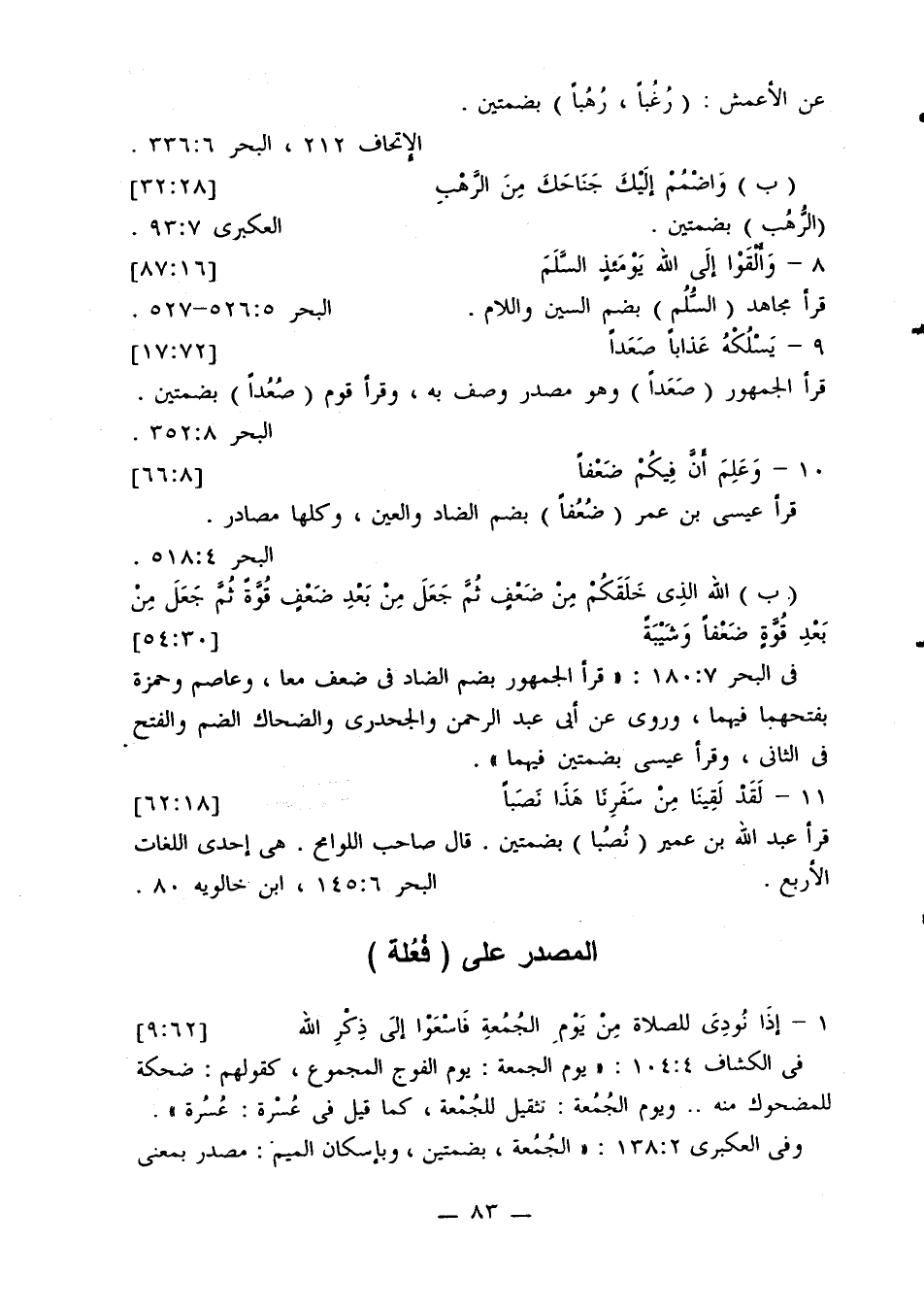 وفي المحتسب 1: 353 - 355: «ومن ذلك قراءة عيسى الثقفي وطلحة بن سليمان: (المثلات) وقرأ (المثلات) يحيى بن وثاب. وقراءة الناس (المثلات) قال أبو الفتح: روينا عن أبي حاتم قال: روى زائدة عن الأعمش عن يحيى (المثلات) بالفتح والإسكان. وربما ثقل الأعمش يقول: (المثلات).