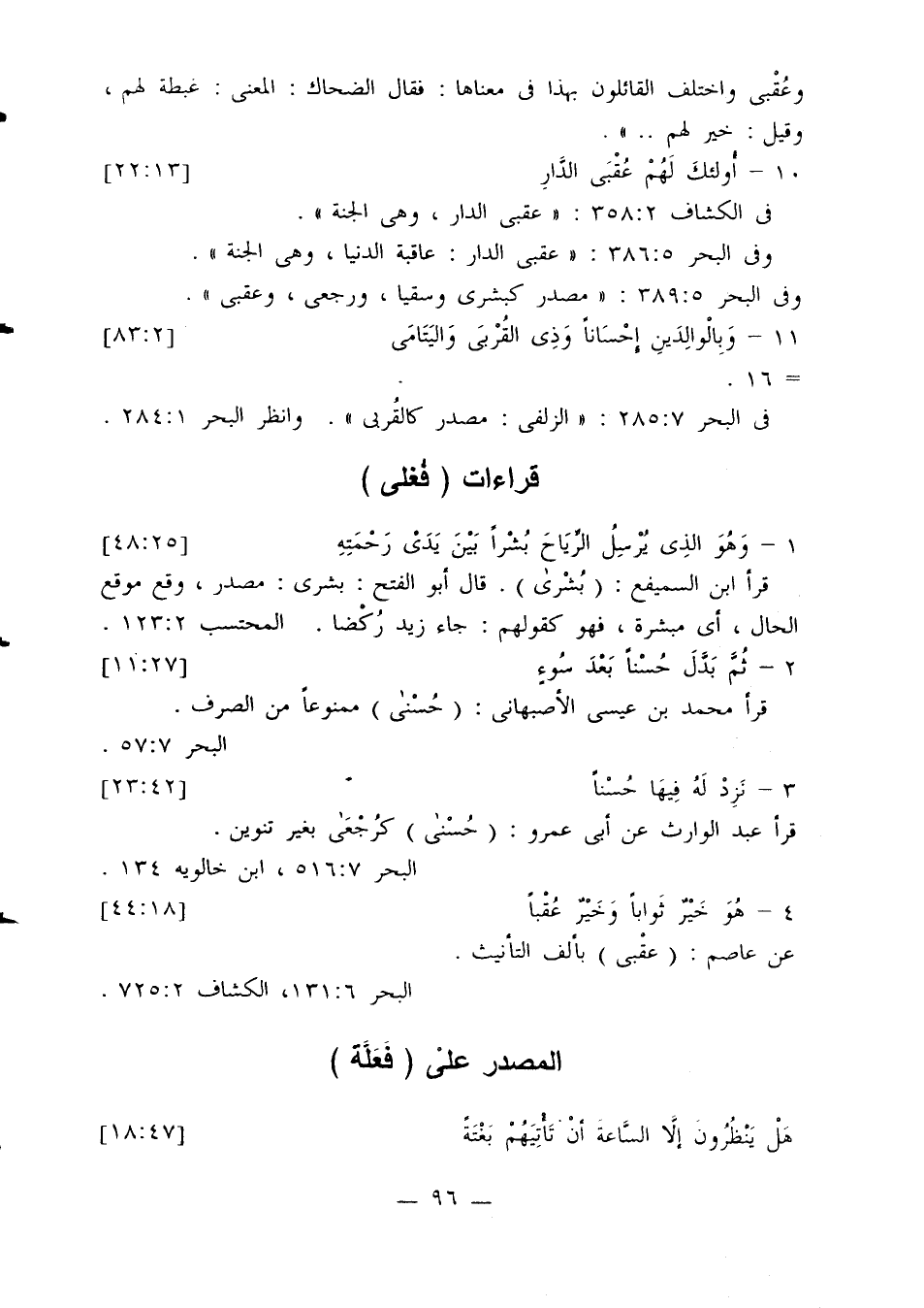 وفي المحتسب 2: 271 - 272: «قال أبو الفتح: فعلة لم تأت في المصادر، ولا في الصفات، وإنما هو مختص بالأسماء، منه: الشربة: اسم موضع. . . وجربة. . . وجاء بلا تاء في الاسم، وهو معد وهبى، وهو الصبي الصغير. ولا بد بإحسان الظن بأبي عمرو، ولاسيما وهو القرآن، وما أبعده عن الزيغ والبهتان».