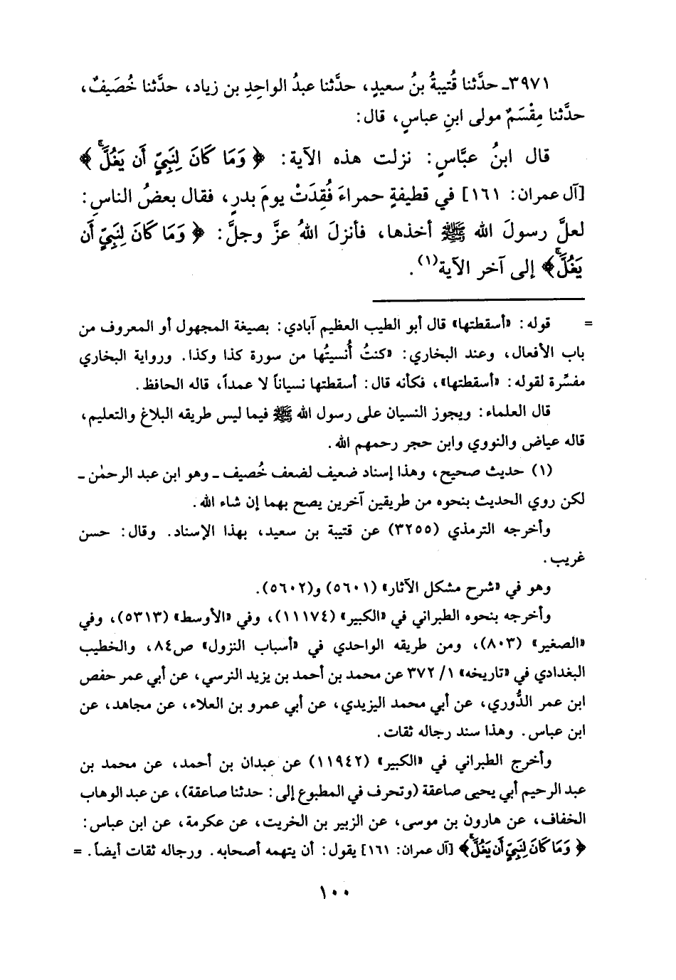 قال ابنُ عبَّاسِ: نزلت هذه الآية: {وَمَا كَانَ لِنَبِيٍّ أَنْ يَغُلَّ} [آل عمران:١٦١] في قطيفةٍ حمراءَ فُقِدَتْ يومَ بدرٍ، فقال بعضُ الناسِ: لعلَّ رسولَ الله - صلَّى الله عليه وسلم - أخذها، فأنزلَ اللهُ عزَ وجلَّ: {وَمَا كَانَ لِنَبِيٍّ أَنْ يَغُلَّ} إلى آخر الآية (¬١).