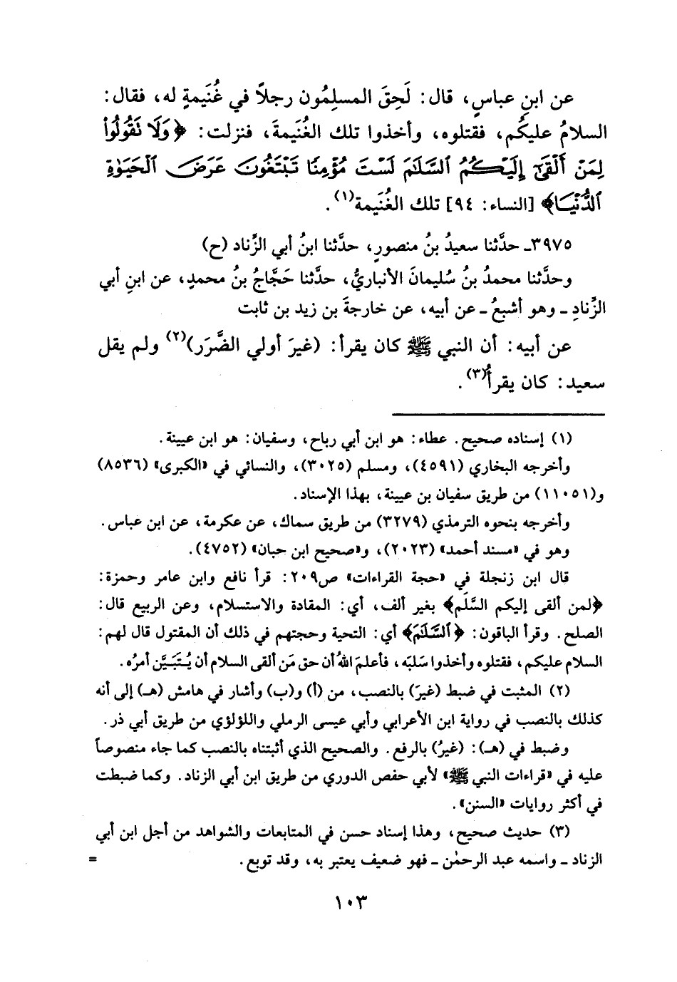 ٣٩٧٥ - حدَّثنا سعيدُ بنُ منصورٍ، حدَّثنا ابنُ أبي الزِّناد (ح) وحدَّثنا محمدُ بنُ سُليمانَ الأنباريُّ، حدَّثنا حَجَّاجُ بنُ محمدٍ، عن ابنِ أبي الزِّنادِ -وهو أشبعُ- عن أبيه، عن خارجةَ بن زيد بن ثابت