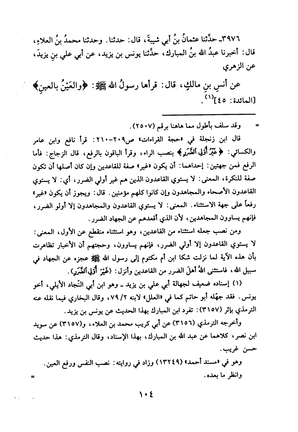 قال ابن زنجلة في "حجة القراءات" ص ٢٥٩ - ٢١٠: قرأ نافع وابن عامر والكسائي: {غَيْرُ أُولِي الضَّرَرِ} بنصب الراء، وقرأ الباقون بالرفع، قال الزجاج: فأما الرفع فمن جهتين: إحداهما: أن يكون "غير" صفة للقاعدين ان كان أصلها أن تكون صفة للنكرة، المعنى: لا يستوي القاعدون الذين هم غير أولي الضرر، أي: لا يستوي القاعدون الأصحاء والمجاهدون وإن كانوا كلهم مؤمنين. قال: ويجوز أن يكون "غير" رفعاً على جهة الاستثناء. المعنى: لا يستوي القاعدون والمجاهدون إلا أولو الضرر، فإنهم يساوون المجاهدين، لأن الذي أقعدهم عن الجهاد الضرر.