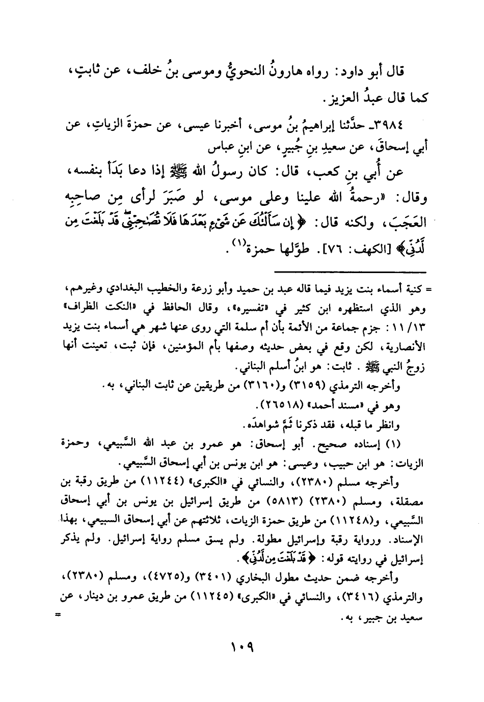 عن أُبي بنِ كعب، قال: كان رسولُ الله - صلَّى الله عليه وسلم - إذا دعا بَدَأ بنفسه، وقال: "رحمةُ الله علينا وعلى موسى، لو صَبَرَ لرأى مِن صاحِبِه العَجَبَ، ولكنه قال: {إِنْ سَأَلْتُكَ عَنْ شَيْءٍ بَعْدَهَا فَلَا تُصَاحِبْنِي قَدْ بَلَغْتَ مِنْ لَدُنِّي عُذْرًا} [الكهف: ٧٦]. طوَّلها حمزة (¬١).