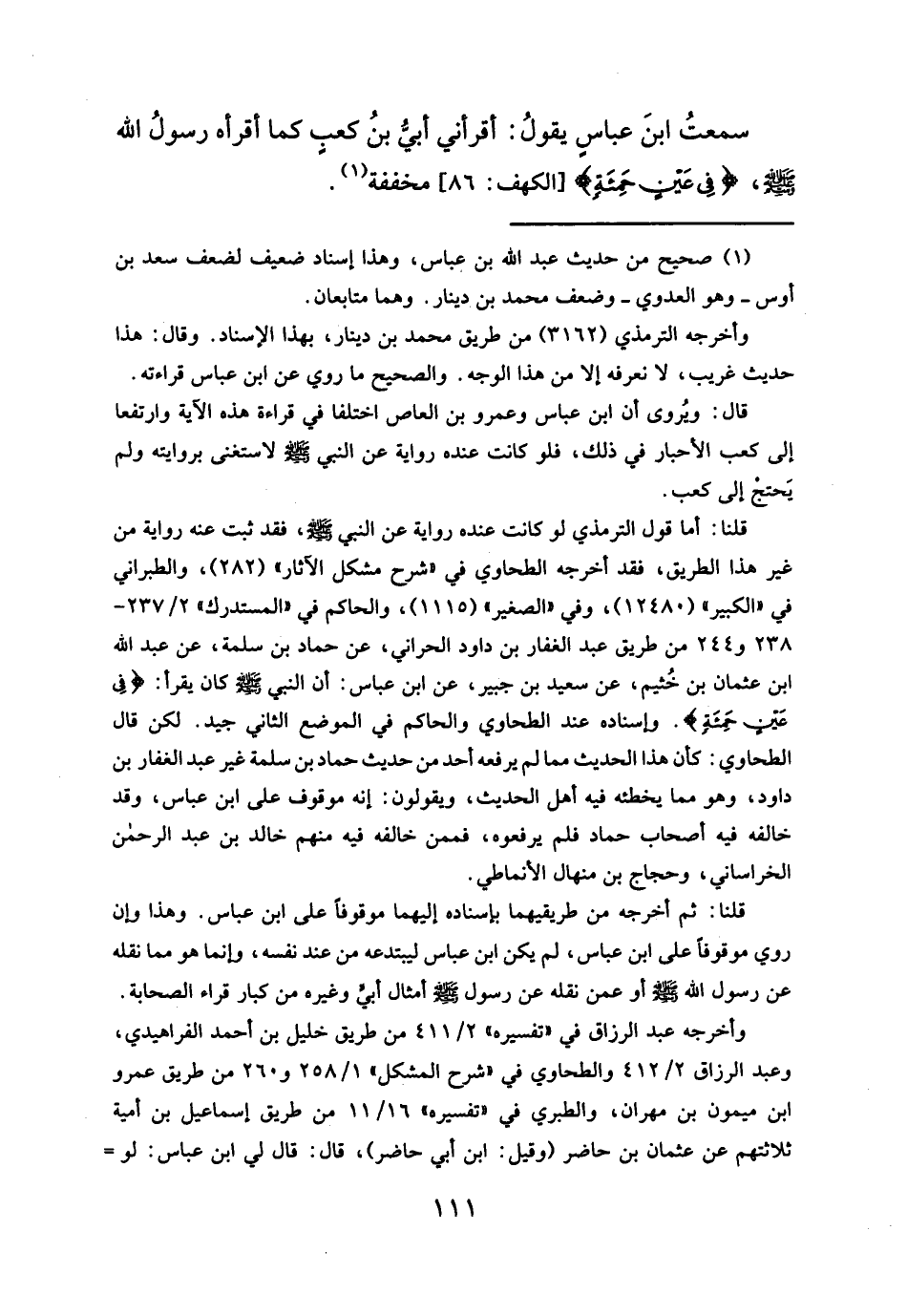 قلنا: أما قول الترمذي لو كانت عنده رواية عن النبي - صلَّى الله عليه وسلم -، فقد ثبت عنه رواية من غير هذا الطريق، فقد أخرجه الطحاوي في "شرح مشكل الآثار" (٢٨٢)، والطبراني في "الكبير" (١٢٤٨٠)، وفي "الصغير" (١١١٥)، والحاكم في "المستدرك" ٢/ ٢٣٧ - ٢٣٨ و ٢٤٤ من طريق عبد الغفار بن داود الحراني، عن حماد بن سلمة، عن عبد الله ابن عثمان بن خُثيم، عن سعيد بن جبير، عن ابن عباس: أن النبي - صلَّى الله عليه وسلم - كان يقرأ {فِي عَيْنٍ حَمِئَةٍ}. وإسناده عند الطحاوي والحاكم في الموضع الثاني جيد. لكن قال الطحاوي: كأن هذا الحديث مما لم يرفعه أحد من حديث حماد بن سلمة غير عبد الغفار بن داود، وهو مما يخطئه فيه أهل الحديث، ويقولون: إنه موقوف على ابن عباس، وقد خالفه فيه أصحاب حماد فلم يرفعوه، فممن خالفه فيه منهم خالد بن عبد الرحمن الخراساني، وحجاج بن منهال الأنماطي.