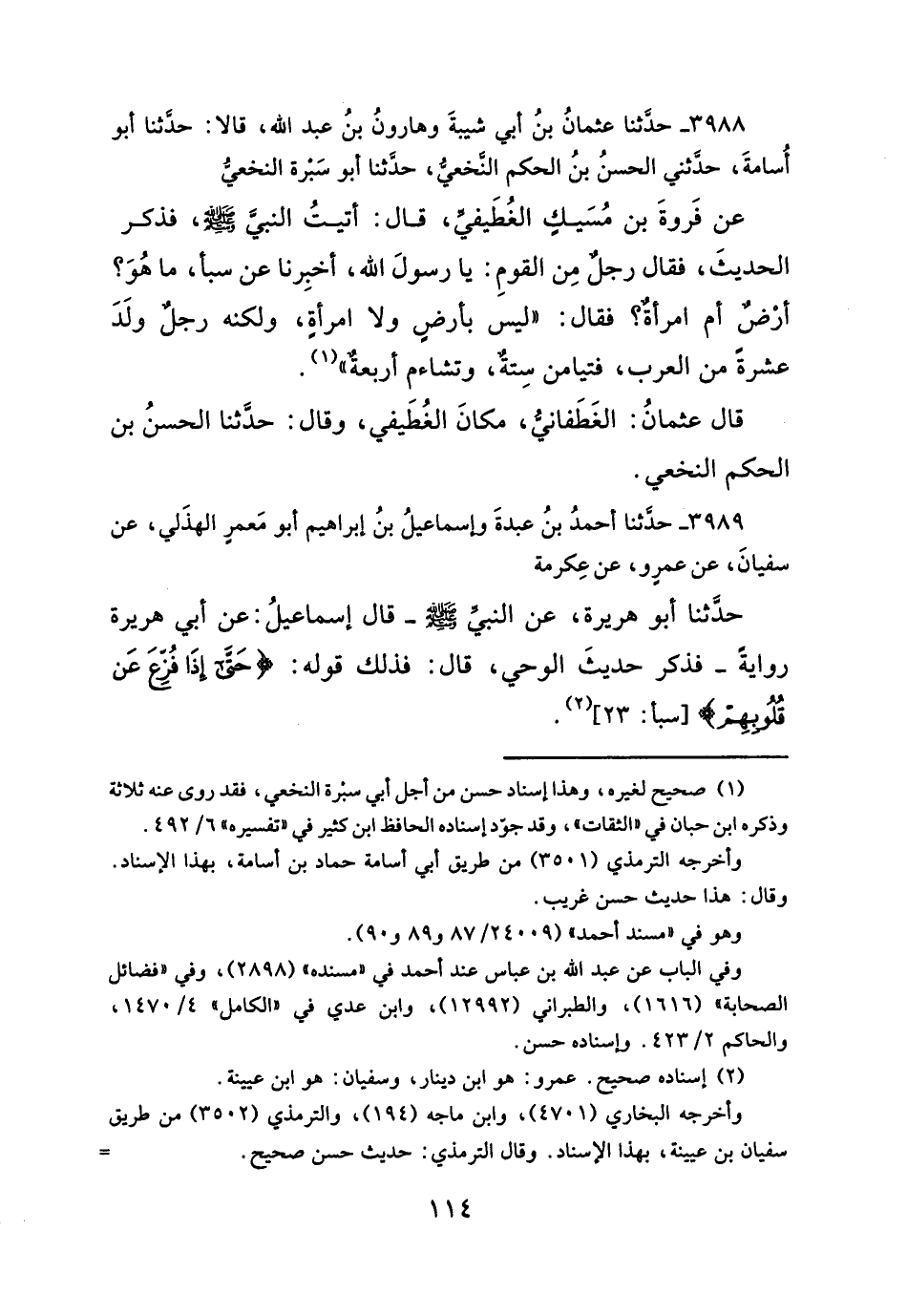 ٣٩٨٨ - حدَّثنا عثمانُ بنُ أبي شيبةَ وهارونُ بنُ عبد الله، قالا: حدَّثنا أبو أُسامةَ، حدَّثني الحسنُ بنُ الحكم النَّخعيُّ، حدَّثنا أبو سَبْرة النخعيُّ