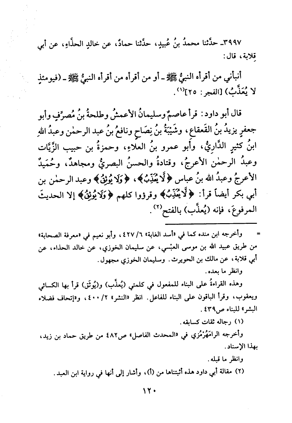 ٣٩٩٧ - حدَّثنا محمدُ بنُ عُبيدٍ، حدَّثنا حمادٌ، عن خالدٍ الحذَّاءِ، عن أبي قِلابة، قال: أنباني من أقرأه النبيُّ -صلَّى الله عليه وسلم- أو من أقرأه من أقرأه النبيُّ - صلَّى الله عليه وسلم - (فيومئذٍ لا يُعَذَّبُ) [الفجر:٢٥] (¬١).
