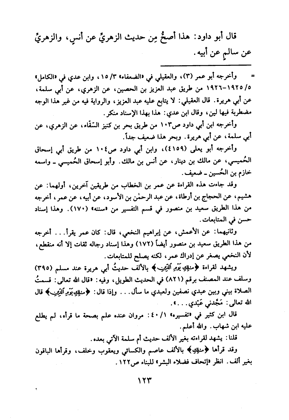 قال أبو داود: هذا أصحُّ مِن حديث الزهريِّ عن أنسٍ، والزهريِّ عن سالمٍ عن أبيه.