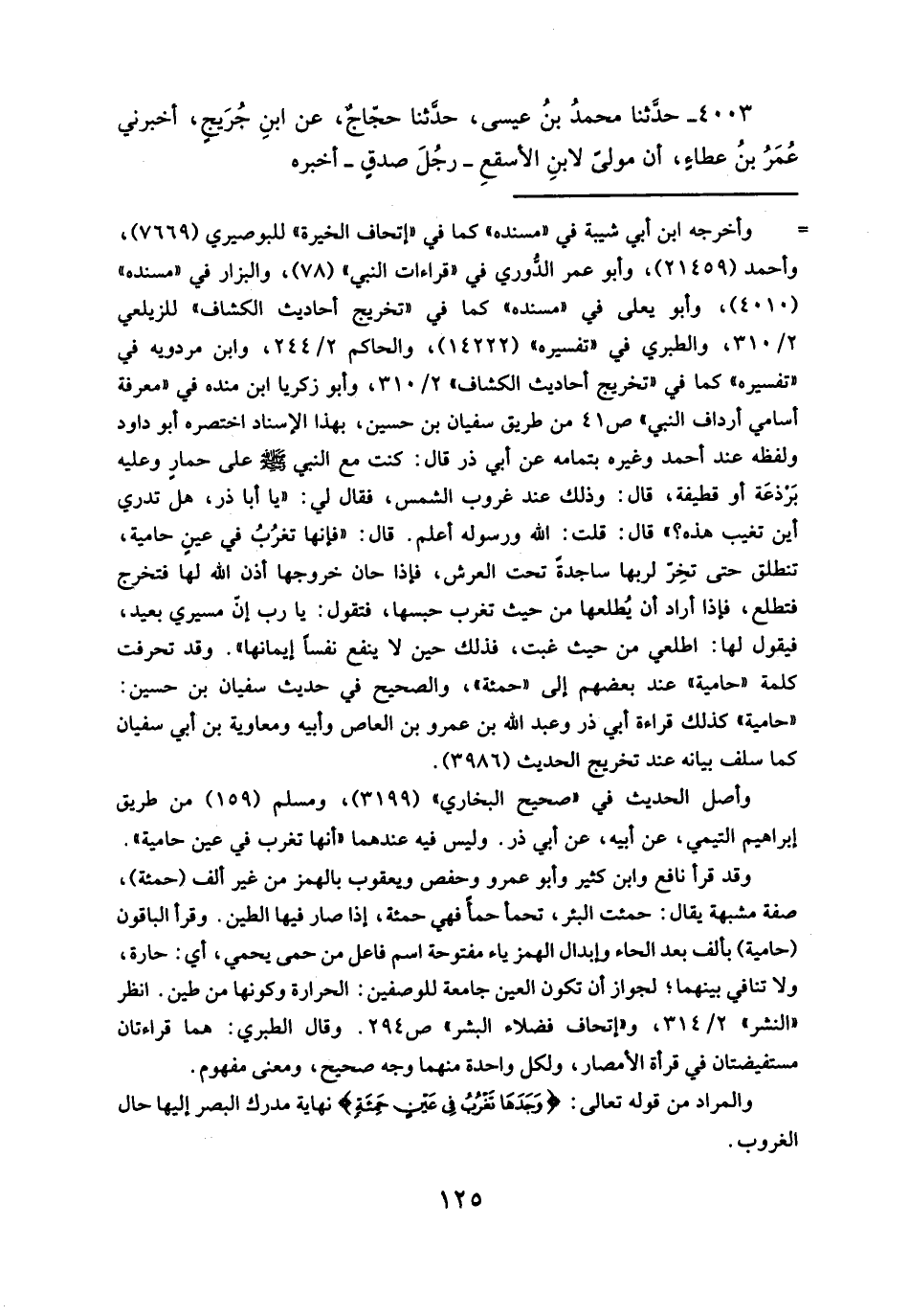 وأصل الحديث في "صحيح البخاري" (٣١٩٩)، ومسلم (١٥٩) من طريق إبراهيم التيمي، عن أبيه، عن أبي ذر. وليس فيه عندهما "أنها تغرب في عين حامية".