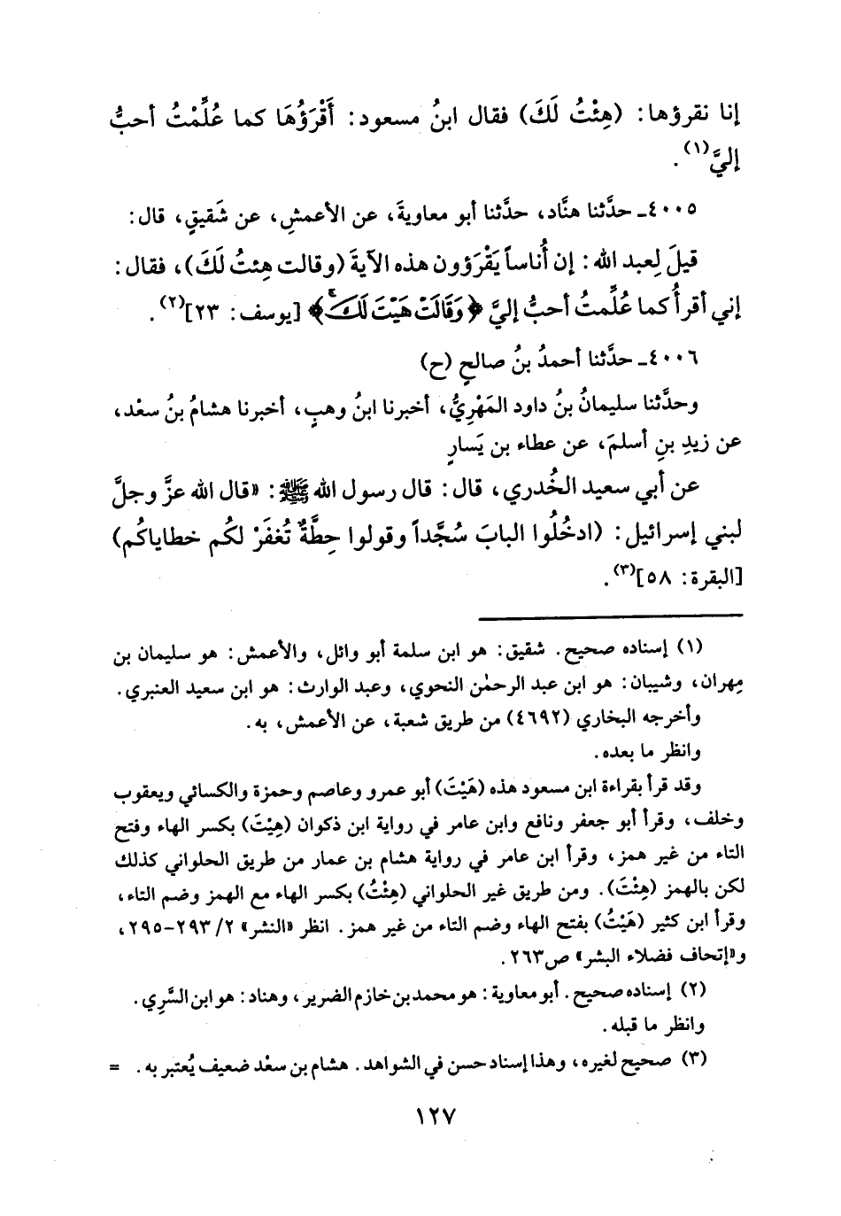 ٤٠٠٥ - حدَّثنا هنَّاد، حدَّثنا أبو معاويةَ، عن الأعمشِ، عن شَقيقٍ، قال: قيلَ لِعبد الله: إن أُناساً يَقْرَؤون هذه الأيةَ (وقالت هِئتُ لَكَ)، فقال: إني أقرأُ كما عُلِّمتُ أحبُّ إليَّ {وَقَالَتْ هَيْتَ لَكَ} [يوسف:٢٣] (¬٢).
