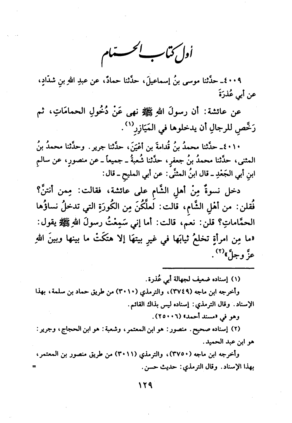 عن عائشة: أن رسولَ الله - صلَّى الله عليه وسلم - نهى عَنْ دُخُولِ الحمامَاتِ، ثم رَخَّصِ للرجالِ أن يدخلوها في المَيَازِرِ (¬١).