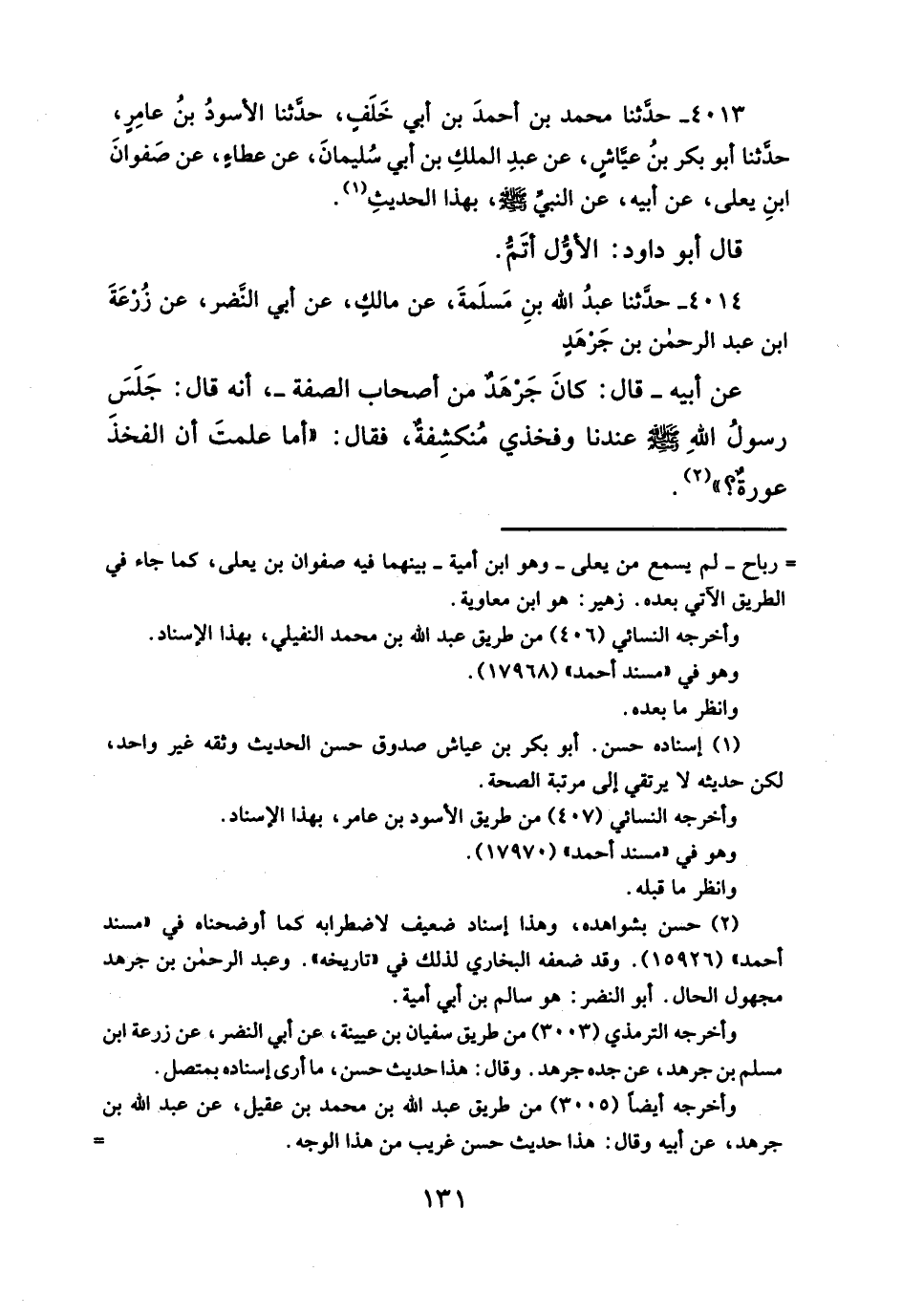 وأخرجه الترمذي (٣٠٠٣) من طريق سفيان بن عيينة، عن أبي النضر، عن زرعة ابن مسلم بن جرهد، عن جده جرهد. وقال: هذا حديث حسن، ما أرى إسناده بمتصل.