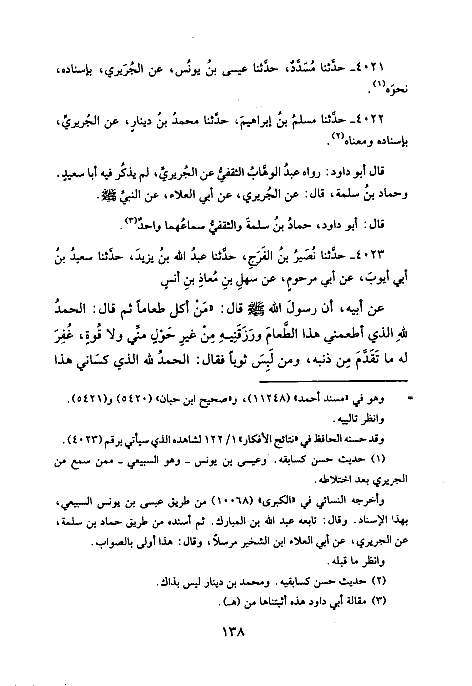 ٤٠٢١ - حدَّثنا مُسَدَّدٌ حدَّثنا عيسى بنُ يونُس، عن الجُرَيري، بإسناده، نحوَه (¬١).