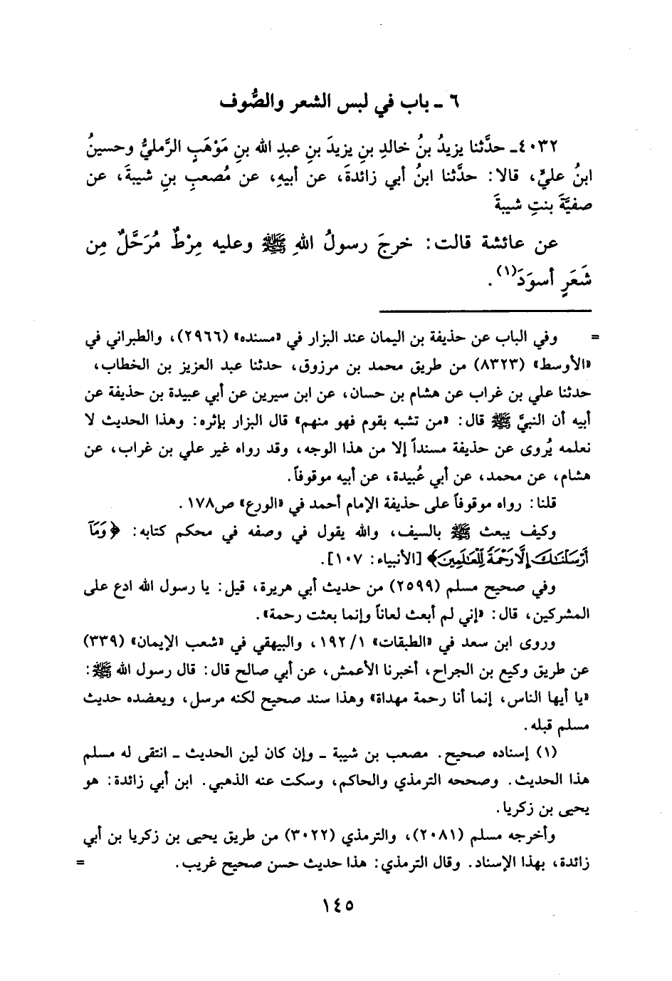 ٤٠٣٢ - حدَّثنا يزيدُ بنُ خالدِ بنِ يزيدَ بنِ عبدِ الله بنِ مَوْهَبِ الرَّمليُّ وحسينُ ابنُ عليٍّ، قالا: حدَّثنا ابنُ أبي زائدةَ، عن أبيهِ، عن مُصعبِ بنِ شيبةَ، عن صفيَّهَ بنتِ شيبةَ عن عائشة قالت: خرجَ رسولُ الله - صلَّى الله عليه وسلم - وعليه مِرْط مُرَحَّلٌ مِن شَعَرٍ أسوَدَ (¬١).