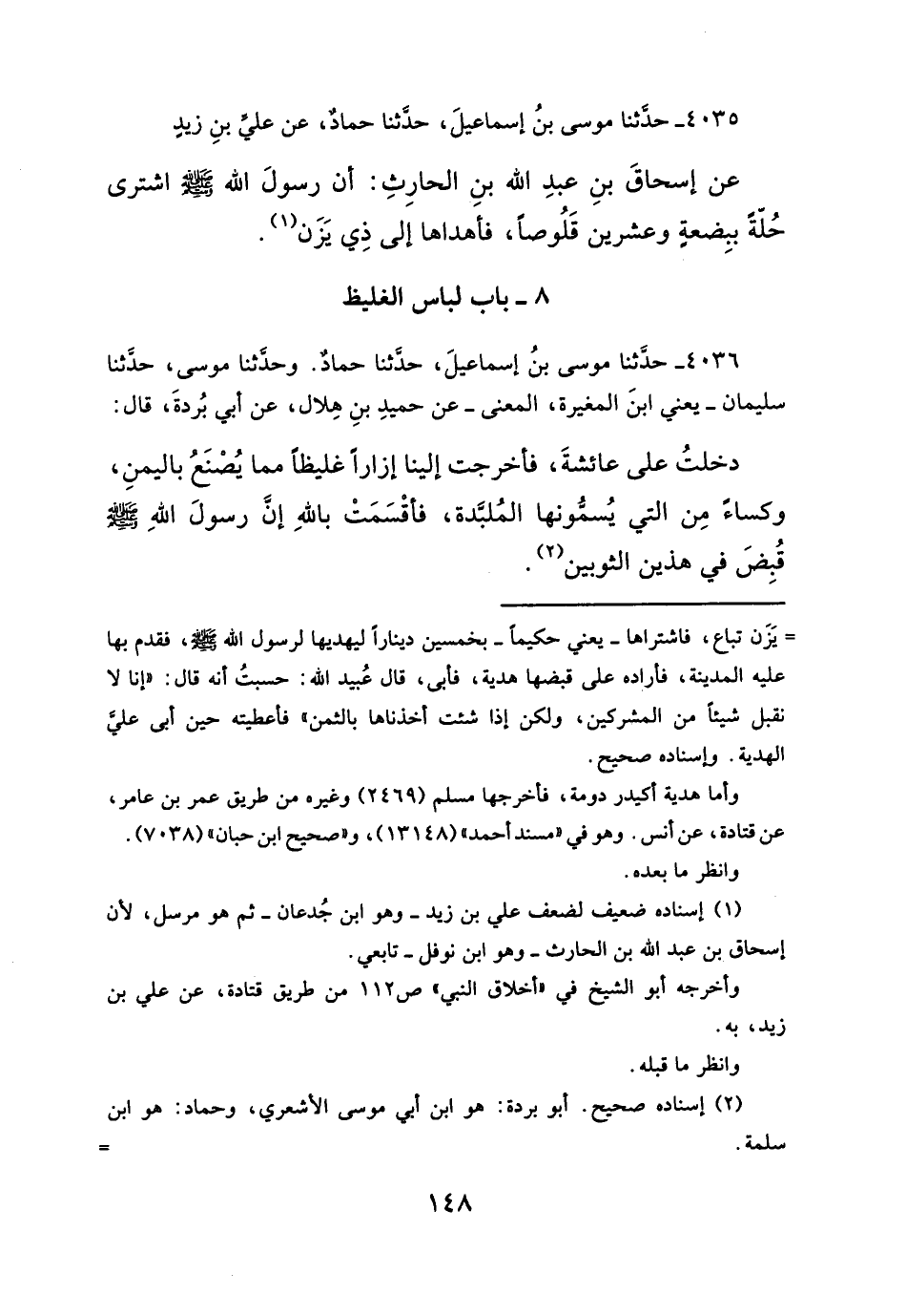 عن إسحاقَ بنِ عبدِ الله بنِ الحارِثِ: أن رسولَ الله - صلَّى الله عليه وسلم - اشترى حُلّةً ببِضعةٍ وعشرين قَلُوصاً، فأهداها إلى ذِي يَزَن (¬١).