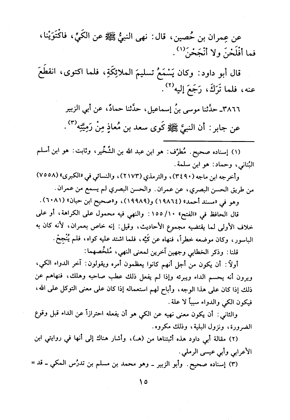 وهو في "مسند أحمد" (١٩٨٦٤) و (١٩٩٨٩)، و "صحيح ابن حبان" (٦٠٨١). قال الحافظ في "الفتح" ١٠/ ١٥٥: والنهي فيه محمول على الكراهة، أو على خلاف الأولى لما يقتضيه مجموع الأحاديث، وقيل: إنه خاص بعمران، لأنه كان به الباسور، وكان موضعه خطراً، فنهاه عن كيِّه، فلما اشتد عليه كواه، فلم يُنْجِحْ. قلنا: وذكر الخطابي وجهين آخرين لمعنى النهي، مُلخَّصهما:
