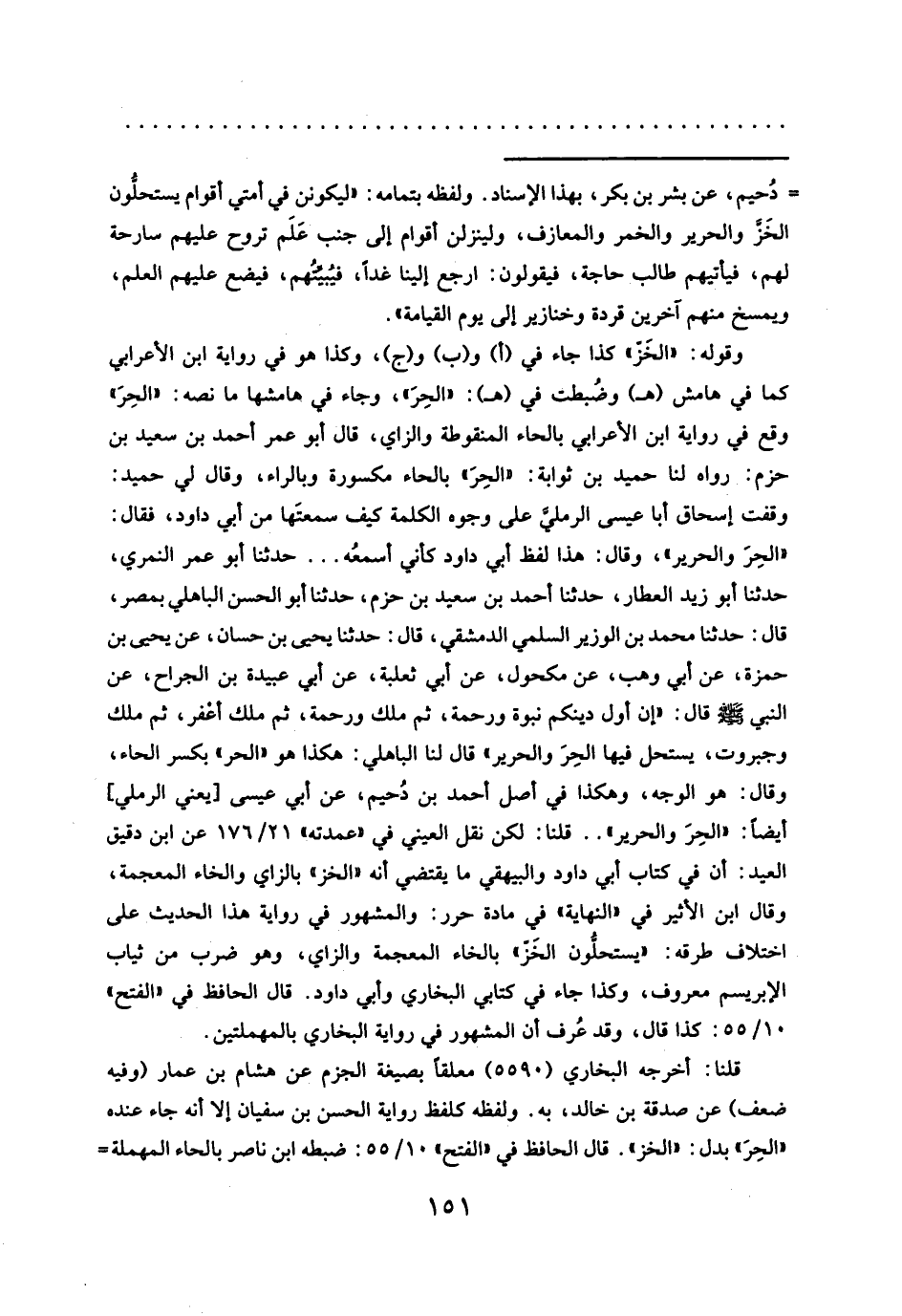 "الحِرَ والحرير"، وقال: هذا لفظ أبي داود كأني أسمعُه ... حدَّثنا أبو عمر النمري، حدَّثنا أبو زيد العطار، حدَّثنا أحمد بن سعيد بن حزم، حدَّثنا أبو الحسن الباهلي بمصر، قال: حدَّثنا محمد بن الوزير السلمي الدمشقي، قال: حدَّثنا يحيى بن حسان، عن يحيى بن حمزة، عن أبي وهب، عن مكحول، عن أبي ثعلبة، عن أبي عبيدة بن الجراح، عن النبي - صلَّى الله عليه وسلم - قال: "إن أول دينكم نبوة ورحمة، ثم ملك ورحمة، ثم ملك أغْفر، ثم ملك وجبروت، يستحل فيها الحِرَ والحرير" قال لنا الباهلي: هكذا هو "الحر" بكسر الحاء، وقال: هو الوجه، وهكذا في أصل أحمد بن دُحيم، عن أبي عيسى [يعني الرملي] أيضاً: "الحِرَ والحرير" .. قلنا: لكن نقل العيني في "عمدته" ٢١/ ١٧٦ عن ابن دقيق العيد: أن في كتاب أبي داود والبيهقي ما يقتضي أنه "الخز" بالزاي والخاء المعجمة، وقال ابن الأثير في "النهاية" في مادة حرر: والمشهور في رواية هذا الحديث على اختلاف طرقه: "يستحلُّون الخَزّ، بالخاء المعجمة والزاي، وهو ضرب من ثياب الابريسم معروف، وكذا جاء في كتابي البخاري وأبي داود. قال الحافظ في "الفتح" ١٠/ ٥٥: كذا قال، وقد عُرف أن المشهور في رواية البخاري بالمهملتين.