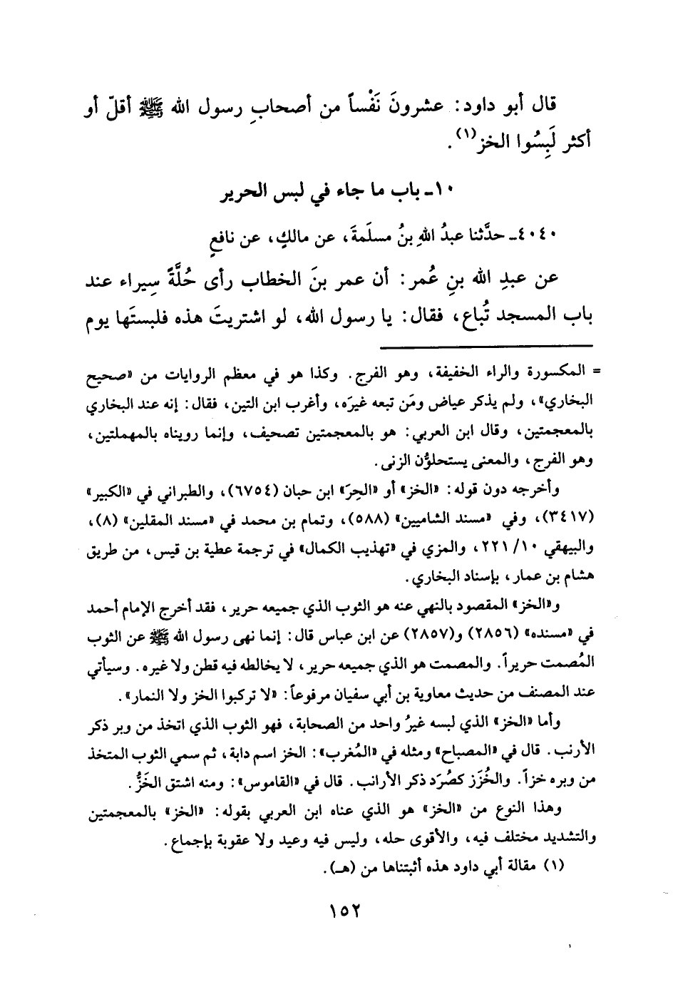 قال أبو داود: عشرونَ نَفْساً من أصحابِ رسول الله - صلَّى الله عليه وسلم - أقلّ أو أكثر لَبِسُوا الخز (¬١).