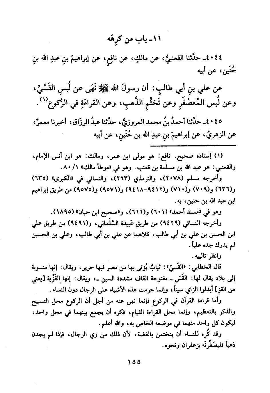 عن علي بنِ أبي طالبِ: أن رسولَ الله - صلَّى الله عليه وسلم - نَهَى عن لُبسِ القَسِّيِّ، وعن لُبس المُعصْفَرِ وعن تَختُّمِ الذَّهبِ، وعن القراءَةِ في الرُّكوع (¬١).