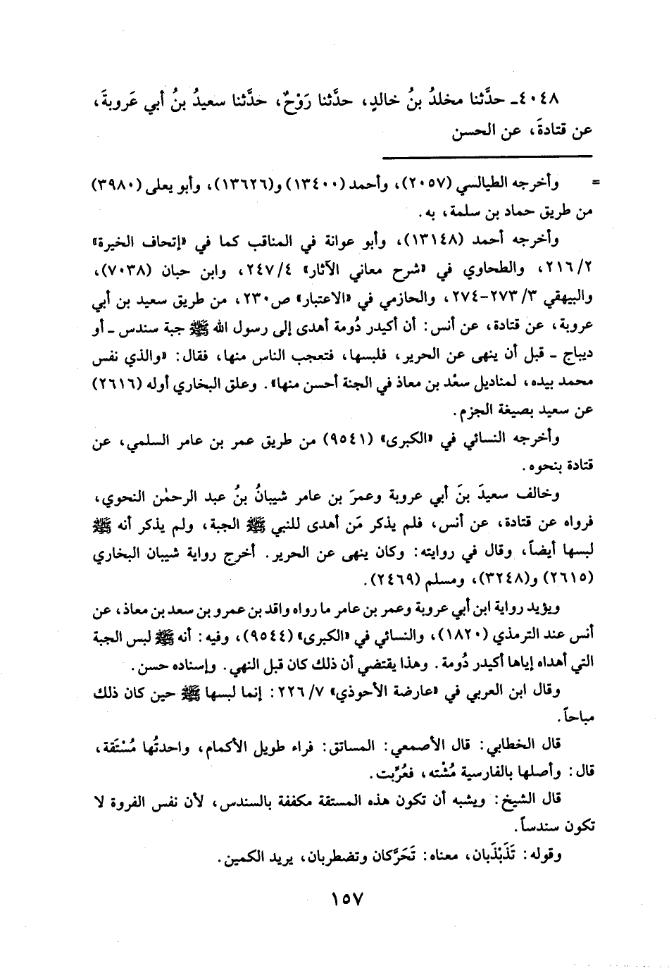 وخالف سعيدَ بنَ أبي عروبة وعمرَ بن عامر شيبانُ بنُ عبد الرحمن النحوي، فرواه عن قتادة، عن أنس، فلم يذكر مَن أهدى للنبي -صلَّى الله عليه وسلم- الجبة، ولم يذكر أنه -صلَّى الله عليه وسلم- لبسها أيضاً، وقال في روايته: وكان ينهى عن الحرير. أخرج رواية شيبان البخاري (٢٦١٥) و (٣٢٤٨)، ومسلم (٢٤٦٩).