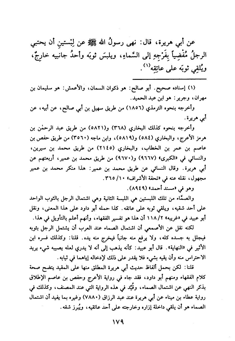 قلنا: لكن بحمل ألفاظ حديث أبي هريرة المطلق منها على المقيد يتضح صحة كلام الفقهاء ومنهم أبو داود، فقد جاء في رواية الأعرج وحفص بن عاصم الإطلاق بذكر النهي عن اشتمال الصماء، وقُيِّد في هذه الرواية التي عند المصنف، وكذلك في رواية عطاء بن ميناء عن أبي هريرة عند عبد الرزاق (٧٨٨٠) وغيره بما يفيد أن اشتمال الصماء هو أن يلقي داخلة إزاره وخارجته على أحد عاتقيه، ويُبرز شقه.