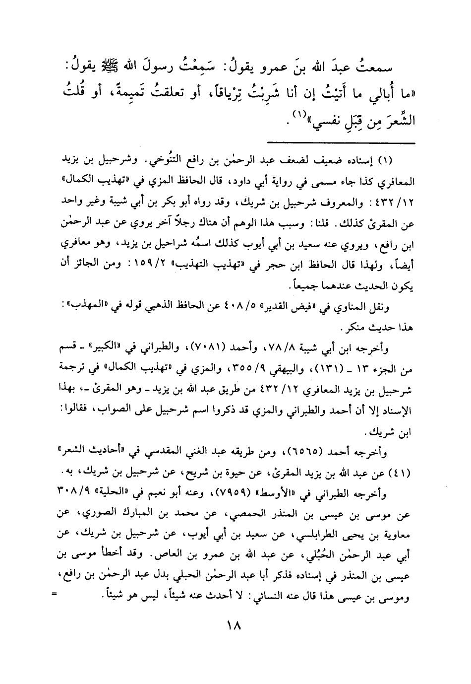 سمعتُ عبدَ الله بنَ عمرو يقولُ: سَمِعْتُ رسولَ الله - صلَّى الله عليه وسلم - يقولُ: "ما أُبالي ما أَتيْتُ إن أنا شَرِبْتُ تِرْياقاً، أو تعلقتُ تَميِمةً، أو قُلتُ الشِّعرَ مِن قِبَلِ نفسي" (¬١).