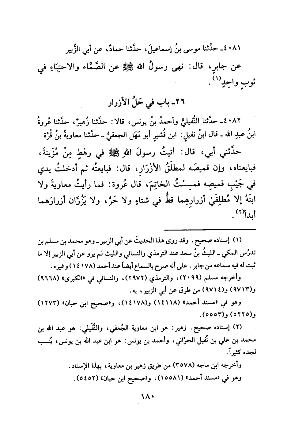 عن جابرِ، قال: نهى رسولُ الله - صلَّى الله عليه وسلم - عن الصَّمَّاء والاحتِبَاءِ في ثوبٍ واحِدٍ (¬١).
