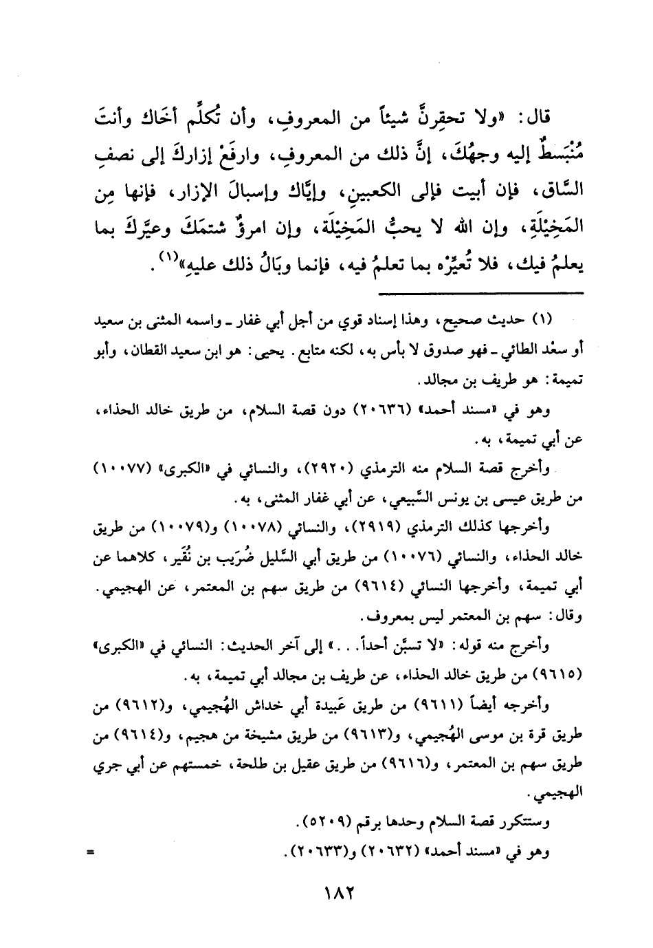 قال: "ولا تحقِرنَّ شيئاً من المعروفِ، وأن تُكلِّم أخَاك وأنتَ مُنْبَسطٌ إليه وجهُكَ، إنَّ ذلك من المعروفِ، وارفَعْ إزاركَ إلى نصفِ السَّاق، فإن أبيت فإلى الكعبينِ، وإيَّاك وإسبالَ الإزار، فإنها مِن المَخِيْلَةِ، وإن الله لا يحبُّ المَخِيْلَة، وإن امرؤٌ شتمَكَ وعيَّركَ بما يعلمُ فيك، فلا تُعيِّرْه بما تعلمُ فيه، فإنما وبَالُ ذلك عليهِ" (¬١).