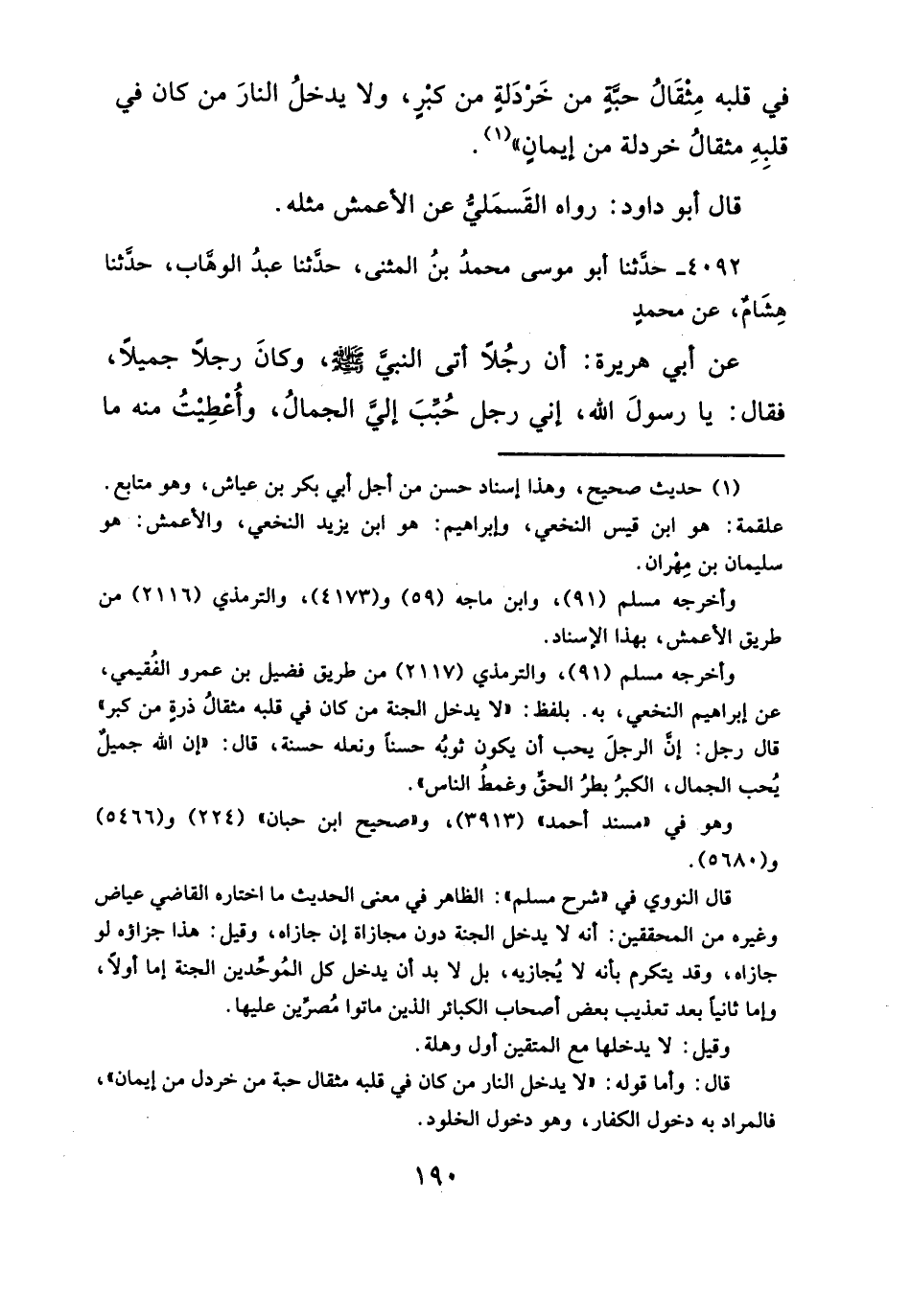 وأخرجه مسلم (٩١)، والترمذي (٢١١٧) من طريق فضيل بن عمرو الفُقيمي، عن إبراهيم النخعي، به. بلفظ: "لا يدخل الجنة من كان في قلبه مثقالُ ذرةٍ من كبر" قال رجل: إنَّ الرجلَ يحب أن يكون ثوبُه حسناً ونعله حسنة، قال: "إن الله جميلٌ يُحب الجمال، الكبرُ بطرُ الحقِّ وغمطُ الناس".
