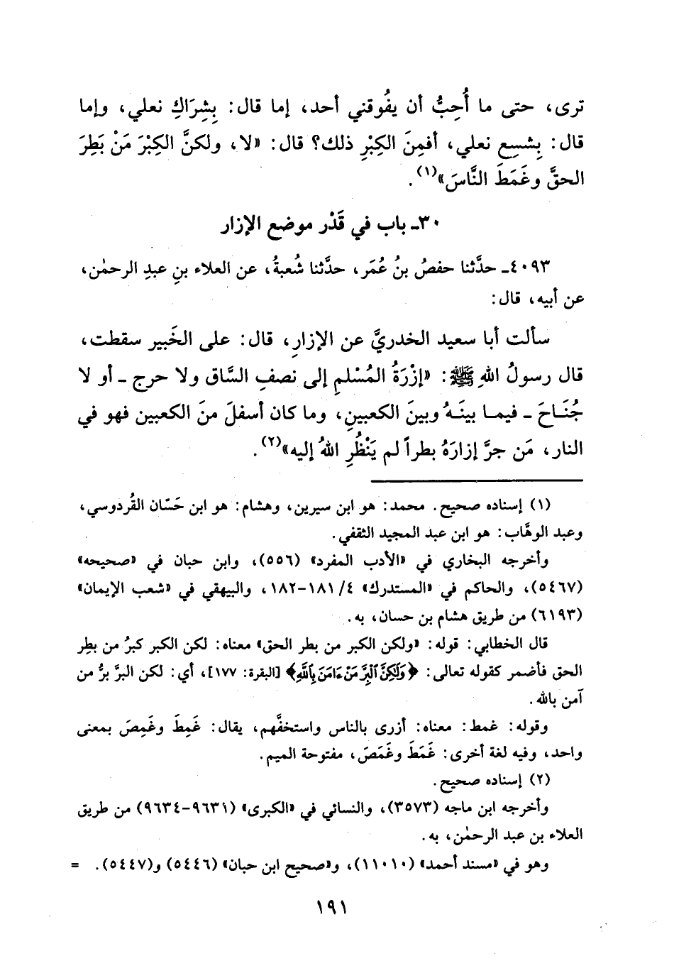 ترى، حتى ما أُحِبُّ أن يفُوقني أحد، إما قال: بِشِرَاكِ نعلي، وإما قال: بِشسِع نعلي، أفمِنَ الكِبْرِ ذلك؟ قال: "لا، ولكنَّ الكِبْرَ مَنْ بَطِرَ الحقَّ وغَمَطَ النَّاسَ" (¬١).