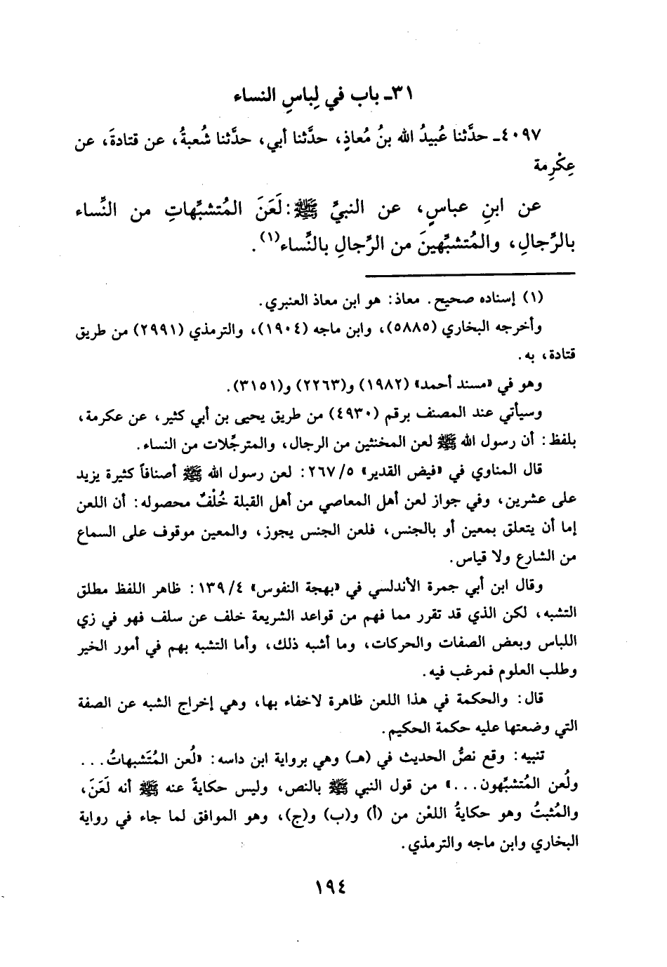 ٤٠٩٧ - حدَّثنا عُبيدُ الله بنُ مُعاذٍ، حدَّثنا أبي، حدَّثنا شُعبةُ، عن قتادةَ، عن عِكْرِمة عن ابنِ عباسٍ، عن النبيَّ -صلَّى الله عليه وسلم-: لَعَنَ المُتشبَّهاتِ من النِّساء بالرِّجالِ، والمُتشبِّهينَ من الرِّجالِ بالنِّساء (¬١).