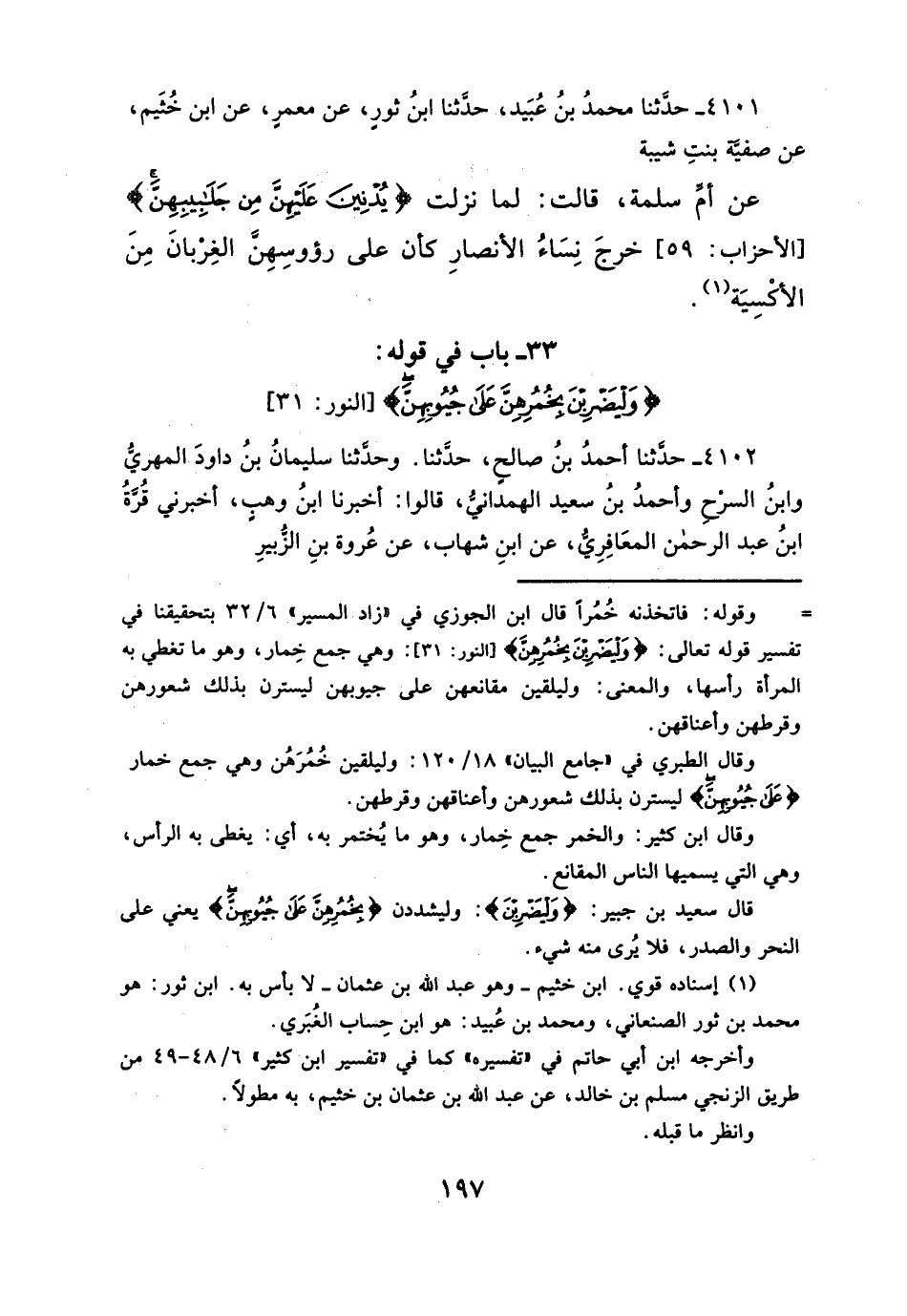 ٣٣ - باب في قوله: {وَلْيَضْرِبْنَ بِخُمُرِهِنَّ عَلَى جُيُوبِهِنَّ} [النور: ٣١]