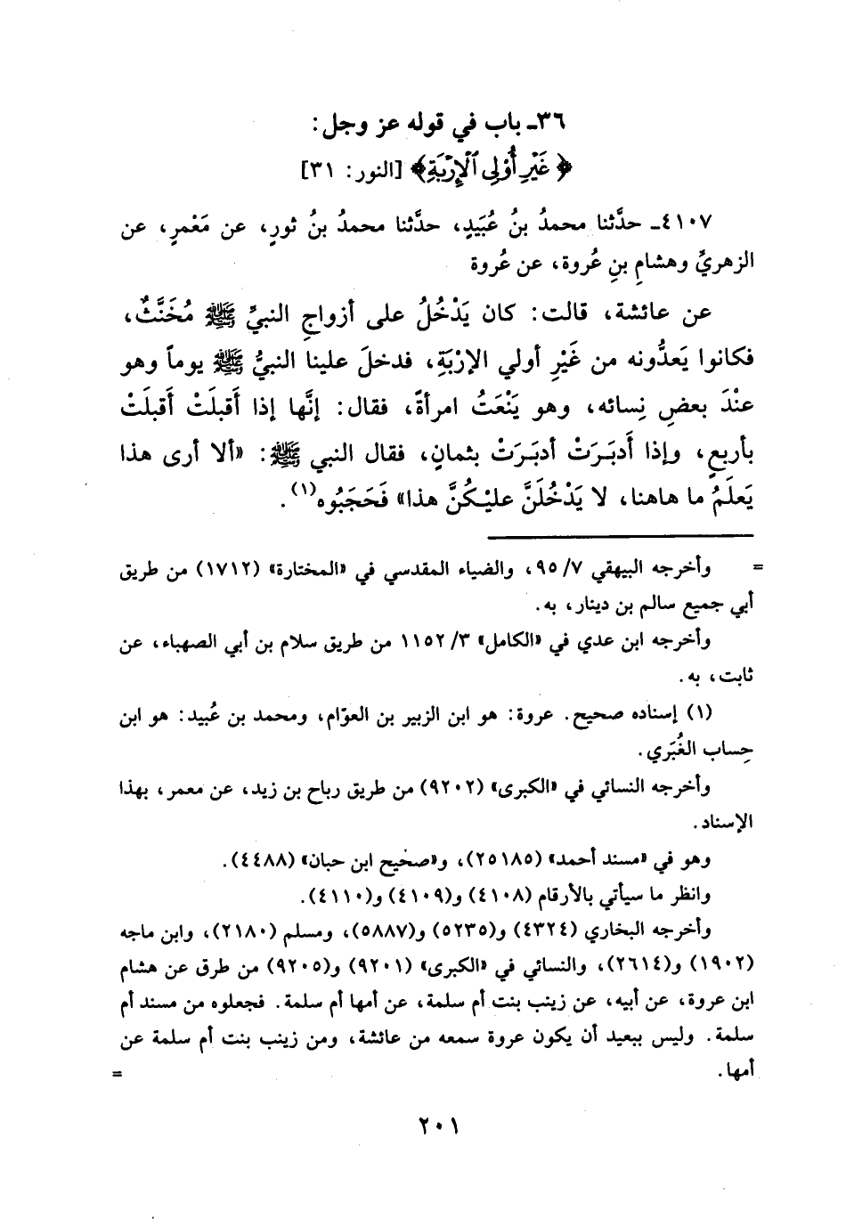 عن عائشة، قالت: كان يَدْخُلُ على أزواجِ النبيِّ - صلَّى الله عليه وسلم - مُخَنَّثٌ، فكانوا يَعدُّونه من غَيرِ أولي الإرْبَةِ، فدخلَ علينا النبيُّ -صلَّى الله عليه وسلم- يوماً وهو عنْدَ بعضِ نِسائه، وهو يَنْعَتُ امرأةً، فقال: إنَّها إذا أَقبلَتْ أَقبلَتْ بأربعٍ، وإذا أَدبَرَتْ أدبَرَتْ بثمانٍ، فقال النبي - صلَّى الله عليه وسلم -: ألا أرى هذا يَعلَمُ ما ها هنا، لا يَذخُلَنَّ عليكُنَّ هذا" فَحَجَبُوه (¬١).