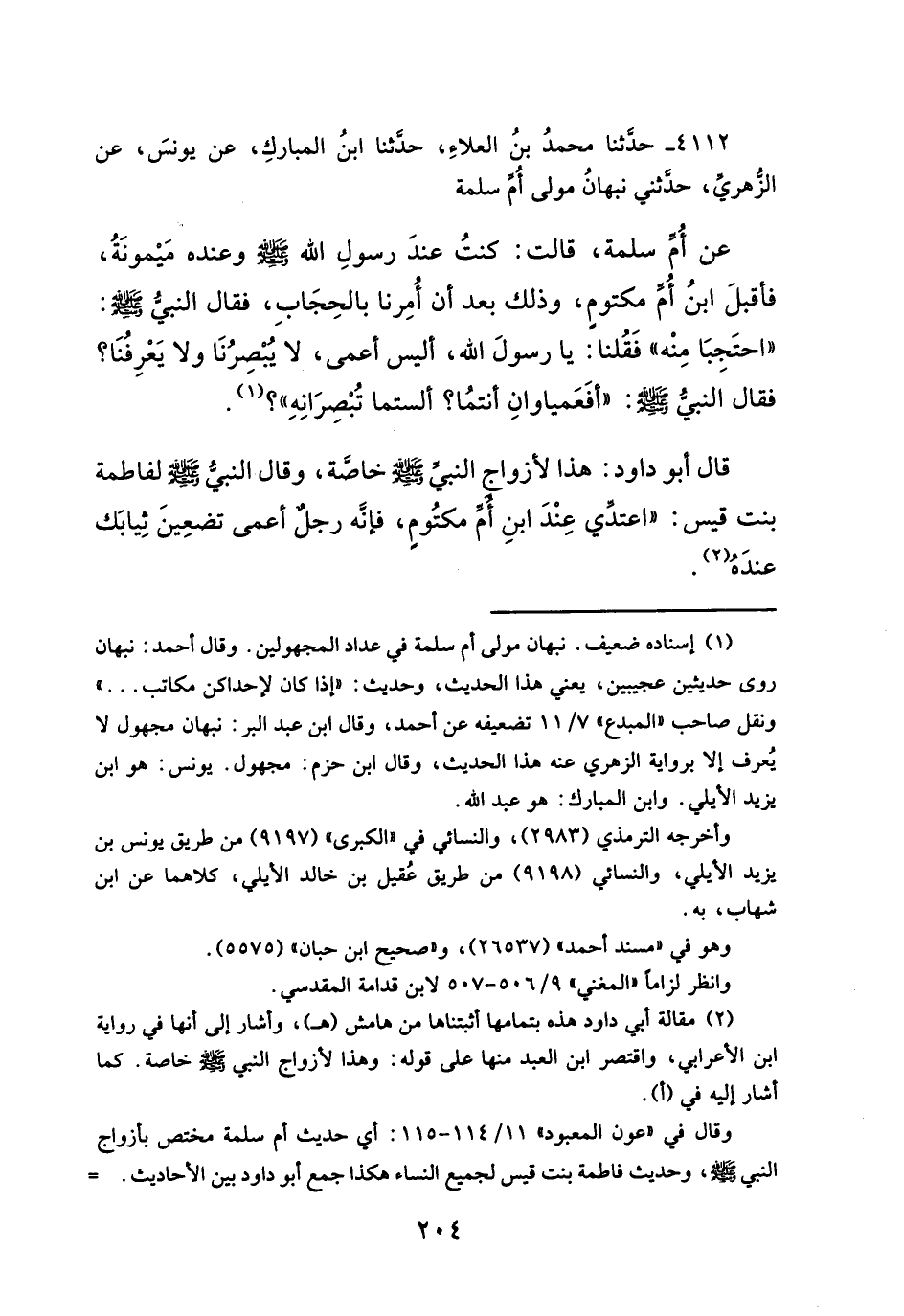 عن أُمِّ سلمة، قالت: كنتُ عندَ رسولِ الله - صلَّى الله عليه وسلم - وعنده "مَيْمونَةُ، فأقبلَ ابنُ أُمَّ مكتومٍ، وذلك بعد أن أُمِرنا بالحِجَابِ، فقال النبيُّ -صلَّى الله عليه وسلم-: "احتَجِبَا مِنْه" فَقُلنا: يا رسولَ الله، أليس أعمى، لا يُبْصِرُنَا ولا يَعْرِفُنَا؟ فقال النبيَّ -صلَّى الله عليه وسلم-: "أفَعَمياوانِ أنتمُا؟ ألستما تُبْصِرَانِهِ"؟ (¬١).