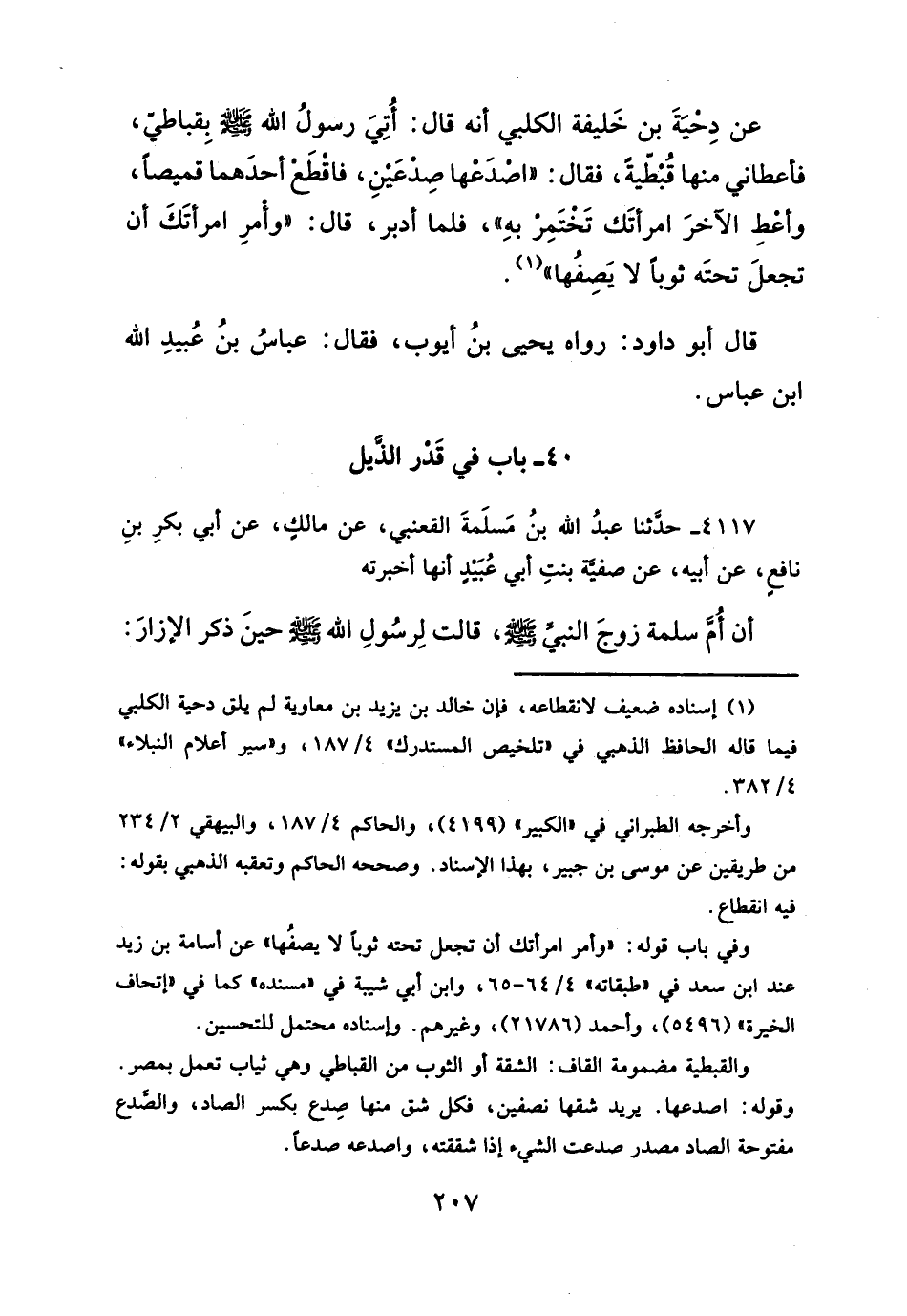 عن دِحْيَةَ بن خَليفة الكلبي أنه قال: أُتِيَ رسولُ الله - صلَّى الله عليه وسلم - بِقباطيّ، فأعطاني منها قُبْطّيةً، فقال: "اصْدَعْها صِدْعَينِ، فاقْطَعْ أحدَهما قميصاً، وأعْطِ الآخرَ امرأتَك تَخْتَمِرْ بهِ"، فلما أدبر، قال: "وأْمرِ امرأتَكَ أن تجعلَ تحتَه ثوباً لايَصِفُها" (¬١).