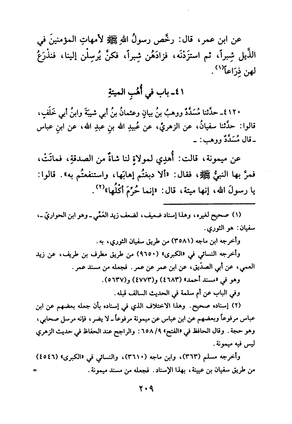 عن ميمونة، قالت: أُهدِي لمولاةٍ لنا شاةٌ من الصدقةِ، فماتَتْ، فمرَّ بها النبيُّ -صلَّى الله عليه وسلم-، فقال: "ألا دبغتُم إهابَها، واستنفعتُم به". قالوا: يا رسولَ الله - صلَّى الله عليه وسلم -، إنها ميتة، قال: "إنما حُرِّمَ أكْلُها" (¬٢).