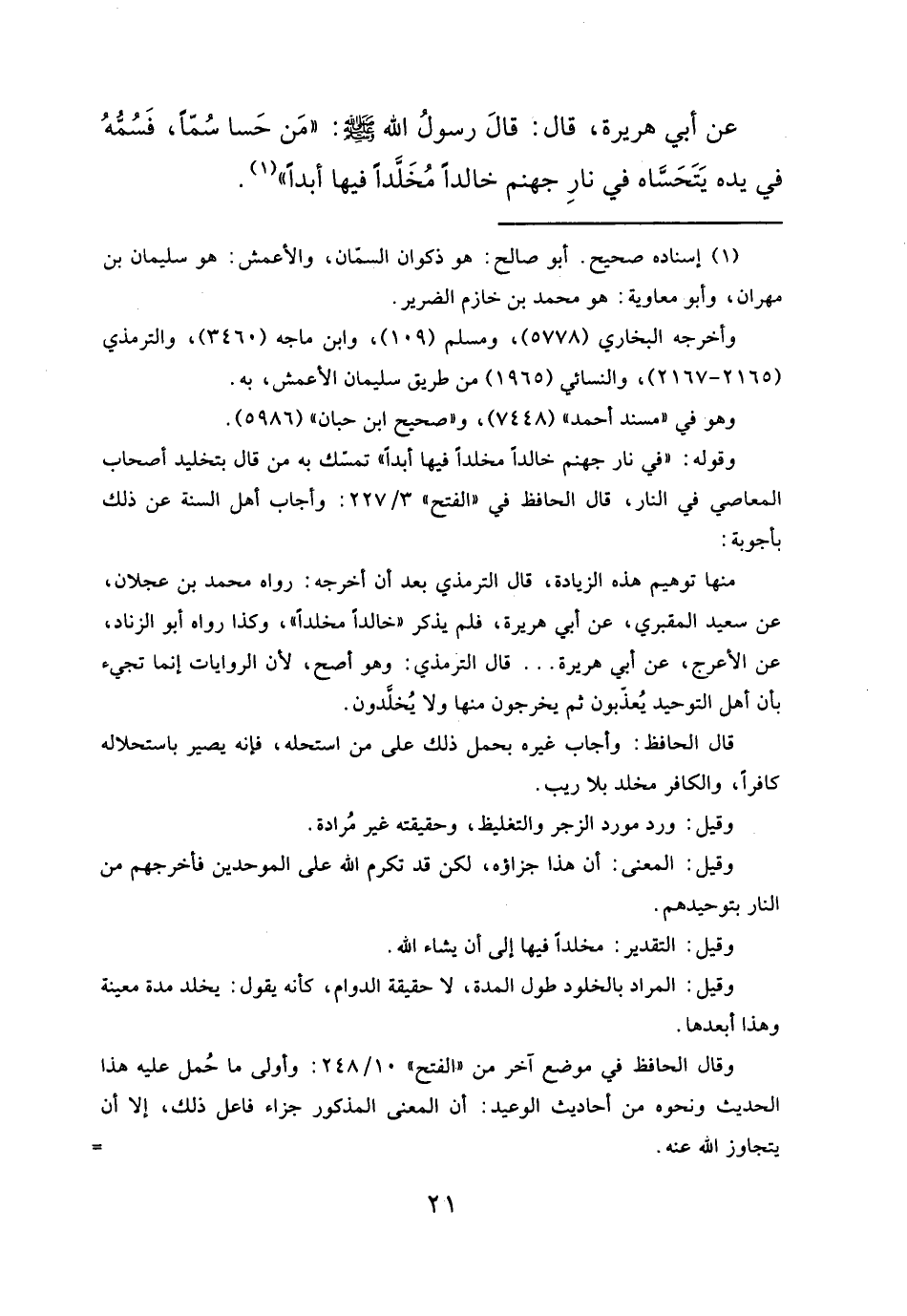 عن أبي هريرة، قال: قالَ رسولُ الله - صلَّى الله عليه وسلم -: "مَن حَسا سُمّاً، فَسُمُّهُ في يده يَتَحَسَّاه في نارِ جهنم خالداً مُخَلَّداً فيها أبداً" (¬١).