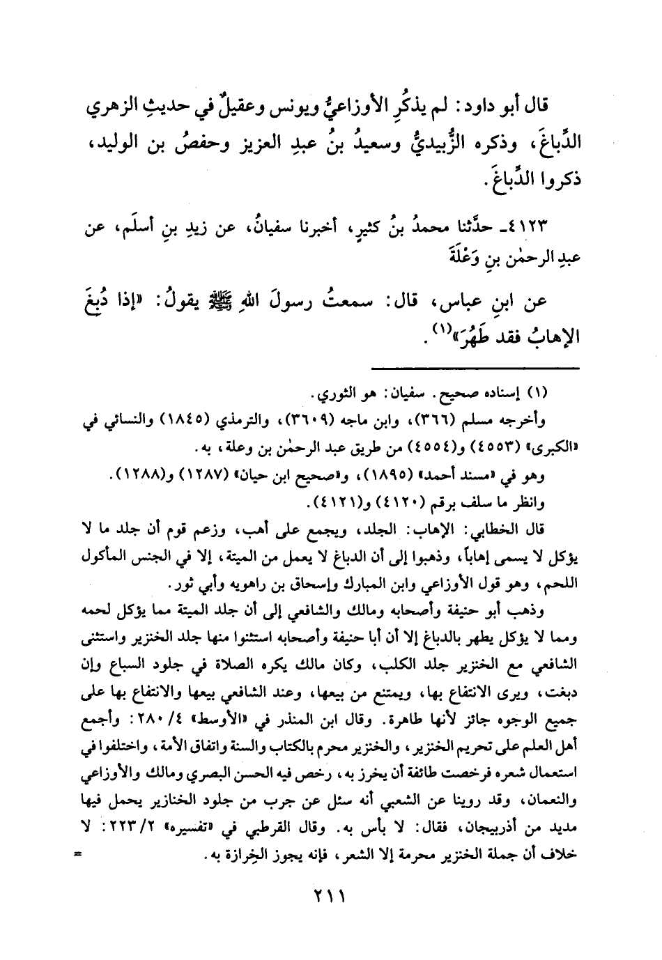 قال أبو داود: لم يذكرِ الأوزاعيُّ ويونس وعقيلٌ في حديثِ الزهري الدِّباغَ، وذكره الزُّبيديُ وسعيدُ بنُ عبدِ العزيز وحفصُ بن الوليد، ذكروا الدِّباغَ.
