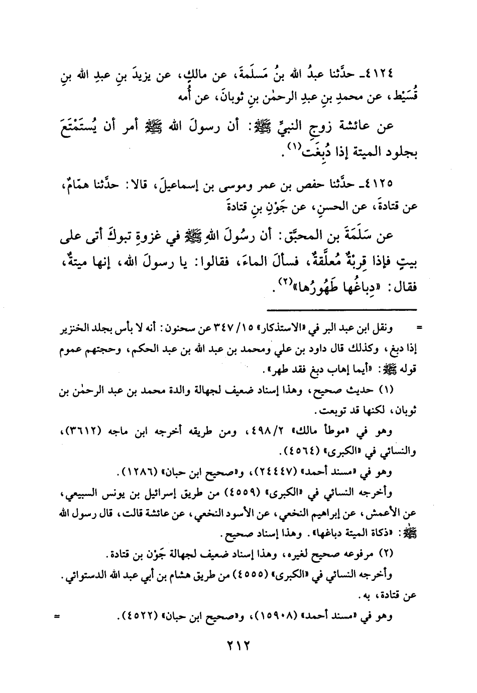 عن سَلَمَةَ بن المحبَّق: أن رسُولَ اللهِ - صلَّى الله عليه وسلم - في غزوةِ تبوكَ أتى على بيتٍ فإذا قِربْةٌ مُعلَّقةٌ، فسألَ الماءَ، فقالوا: يا رسولَ الله، إنها ميتةٌ، فقال: "دِباغُها طَهُورُها" (¬٢).