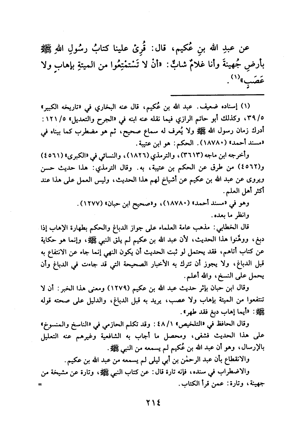 وقال الحافظ في "التلخيص" ١/ ٤٨: وقد تكلم الحازمي في "الناسخ والمنسوخ" على هذا الحديث فشفى، ومحصل ما أجاب به الشافعية وغيرهم عنه التعليل بالإرسال، وهو أن عبد الله بن عُكيم لم يسمعه من النبي - صلَّى الله عليه وسلم -.