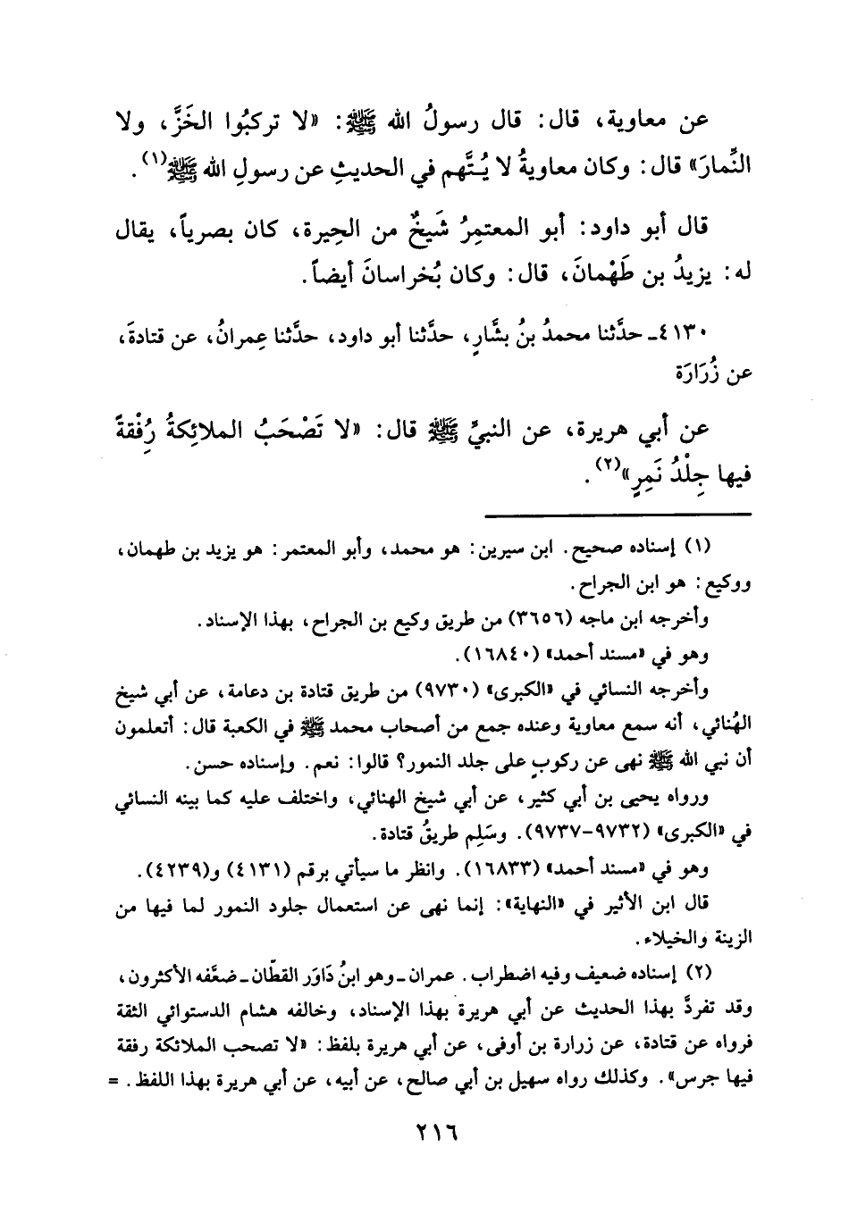 عن معاوية، قال: قال رسولُ الله - صلَّى الله عليه وسلم -: "لا تركبُوا الخَزَّ، ولا النِّمارَ" قال: وكان معاويةُ لا يُتَّهم في الحديثِ عن رسولِ الله - صلَّى الله عليه وسلم - (¬١).