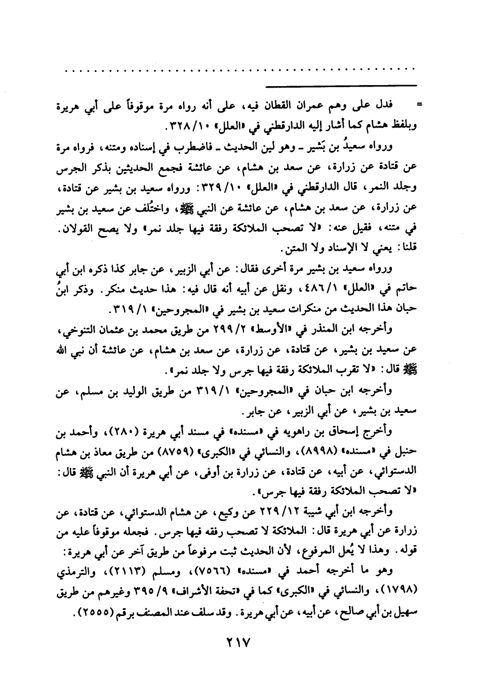 ورواه سعيدُ بن بَشير -وهو لين الحديث- فاضطرب في إسناده ومتنه، فرواه مرة عن قتادة عن زرارة، عن سعد بن هشام، عن عائشة فجمع الحديثين بذكر الجرس وجلد النمر، قال الدارقطني في "العلل" ١٠/ ٣٢٩: ورواه سعيد بن بشير عن قتادة، عن زرارة، عن سعد بن هشام، عن عائشة عن النبي - صلَّى الله عليه وسلم -، واختُلف عن سعيد بن بشير في متنه، فقيل عنه: "لا تصحب الملائكة رفقة فيها جلد نمر" ولا يصح القولان.