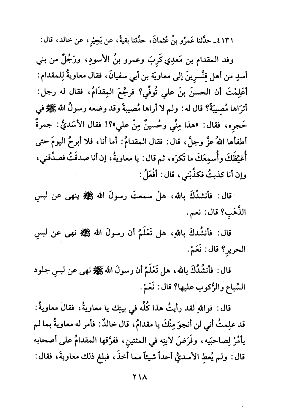 وفد المقدام بن مَعدِي كَرِبَ وعمرو بنُ الأسودِ، ورَجُلٌ من بني أسدِ من أهل قِنَّسرِينَ إلى معاويَة بن أبي سفيانَ، فقال معاويةُ لِلمقدام: أعَلِمْتَ أن الحسنَ بنَ علي تُوفِّي؟ فرجَّعَ المِقدَامُ، فقال له رجل: أترَاها مُصِيبَةً؟ قال له: ولم لا أراها مُصيبةً وقد وضعه رسولُ الله - صلَّى الله عليه وسلم - في حَجرِه، فقال: "هذا مِنِّي وحُسينٌ مِنْ علي"؟! فقال الأسَديُّ: جمرةٌ أطفأها اللهُ عزَّ وجلَّ، قال: فقال المقدامُ: أما أنا، فلا أبرحُ اليومَ حتى أُغيِّظَكَ وأُسمِعَكَ ما تَكرَه، ثم قال: يا معاويةُ، إن أنا صدقَتُ فصدِّقني، وإن أنا كذبتُ فكذِّبْني، قال: أفْعَلُ: قال: فأنشُدُكَ بالله، هلْ سمعتَ رسولَ الله - صلَّى الله عليه وسلم - ينهى عن لبسِ الذَّهَبِ؟ قال: نَعَمْ. قال: فأنشُدكَ باللهِ، هل تَعْلَمُ أن رسولَ الله - صلَّى الله عليه وسلم - نهى عن لبسِ الحريرِ؟ قال: نَعَمْ. قال: فأنشُدُكَ بالله، هل تَعْلَمُ أن رسولَ الله - صلَّى الله عليه وسلم - نهى عن لبسِ جلود السَّباع والرُّكوب عليها؟ قال: نَعَمْ. قال: فواللهِ لقد رأيتُ هذا كُلَّه في بيتِك يا معاويةُ، فقال معاويةُ: قد علِمتُ أني لن أنجوَ مِنْكَ يا مقدامُ، قال خالدٌ: فأمر له معاويةُ بما لم يأمُرْ لِصاحبَيه، وفَرَضَ لابنِه في المئتينِ، ففرَّقها المقدامُ على أصحابه قال: ولم يُعطِ الأسديُّ أحداً شيئاً مما أخذَ، فبلغ ذلك معاويةَ، فقال: