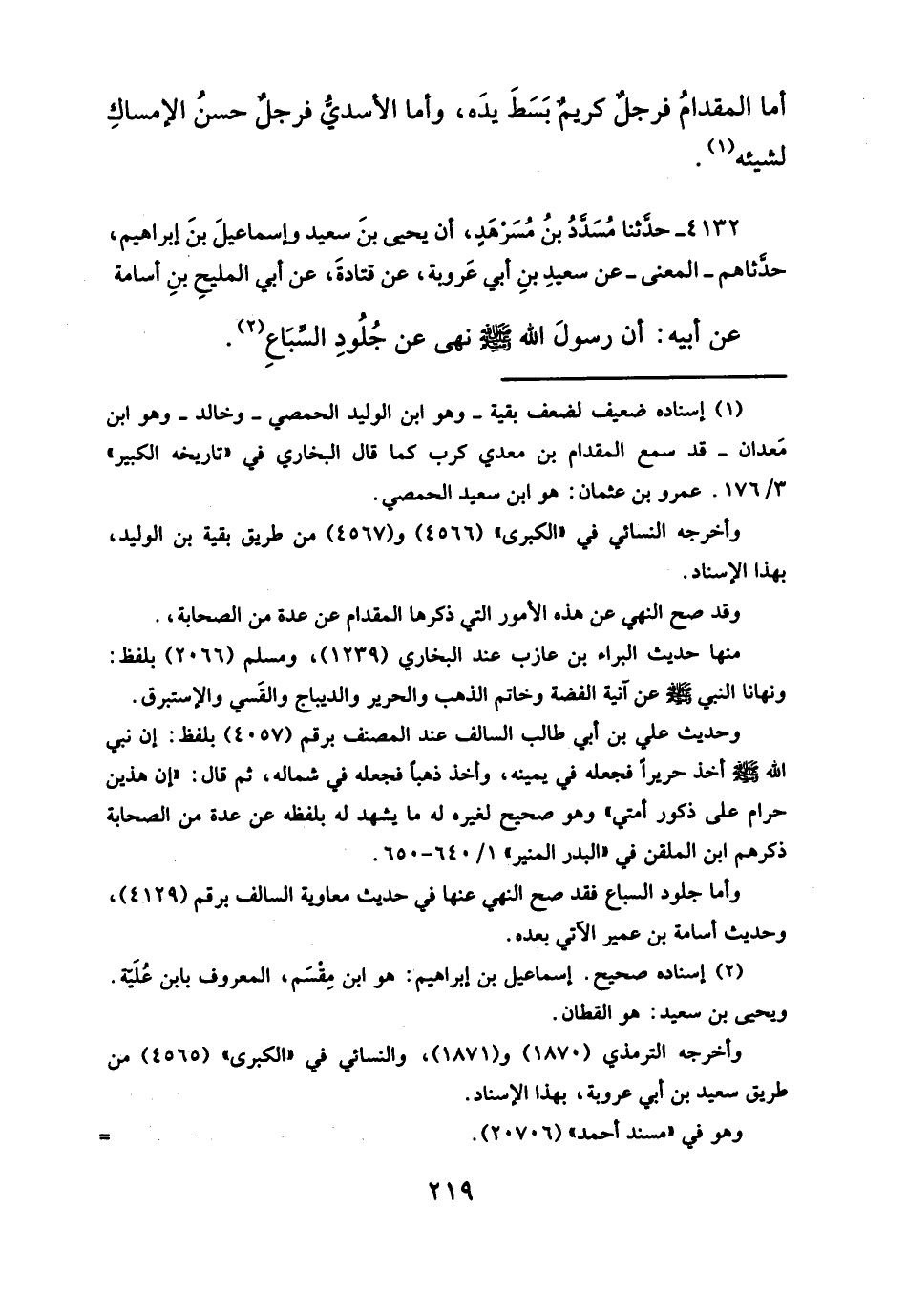 وأما جلود السباع فقد صح النهي عنها في حديث معاوية السالف برقم (٤١٢٩)، وحديث أسامة بن عمير الآتي بعده.